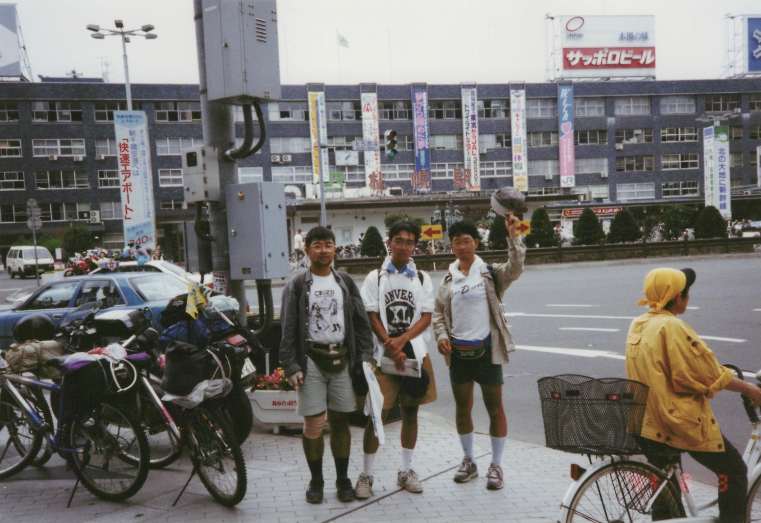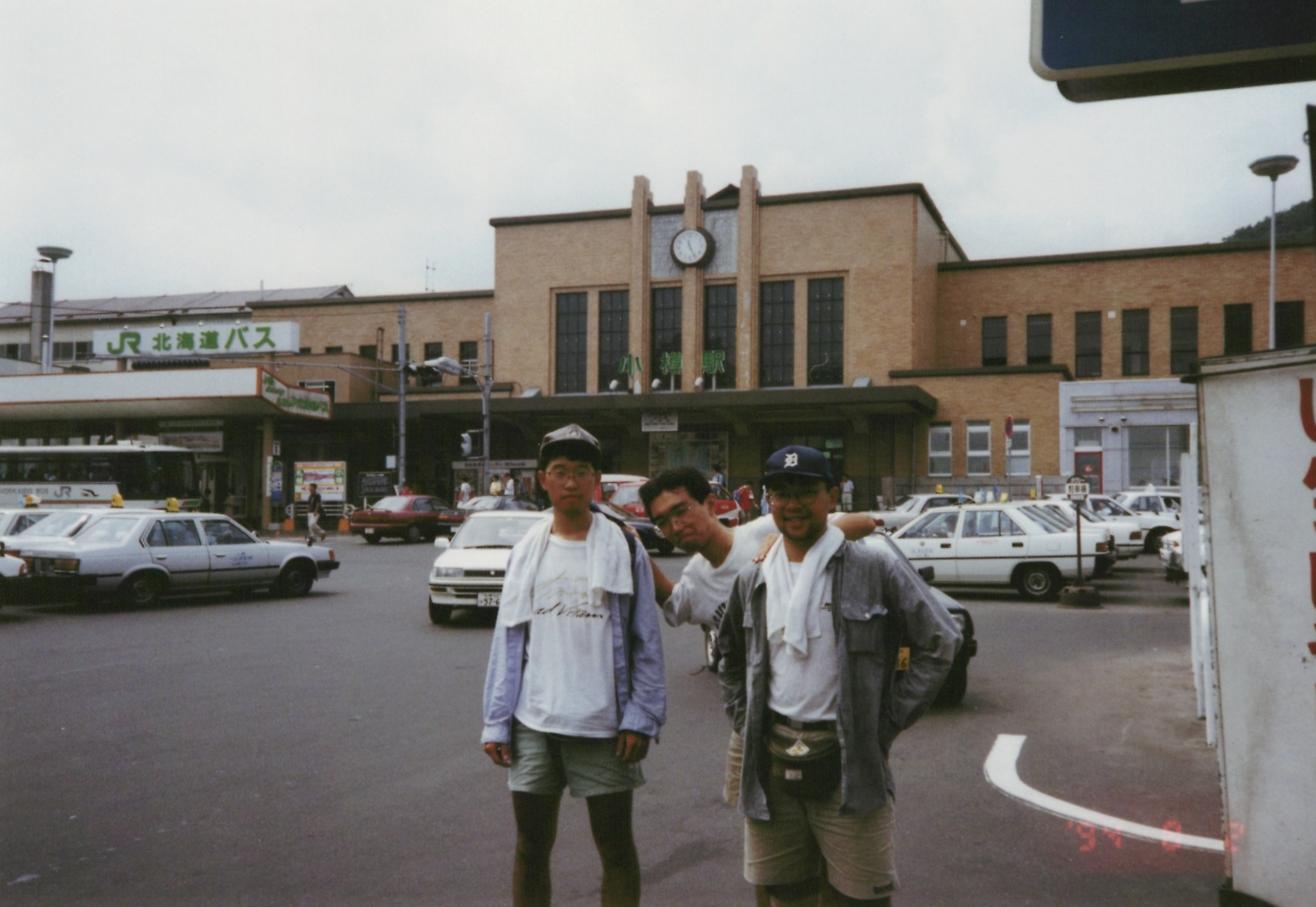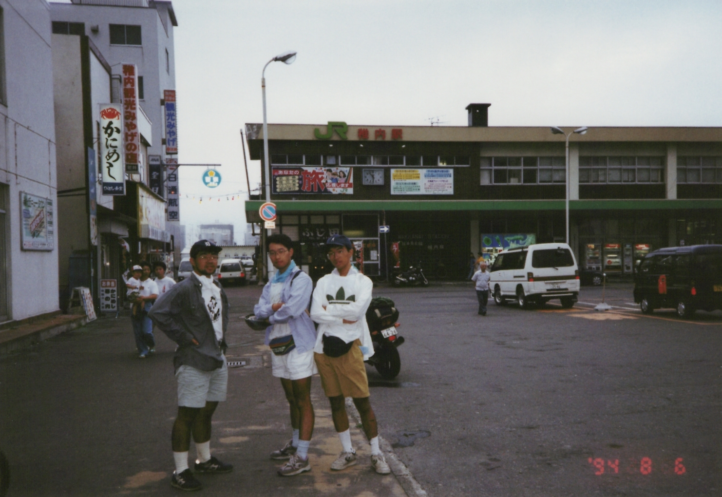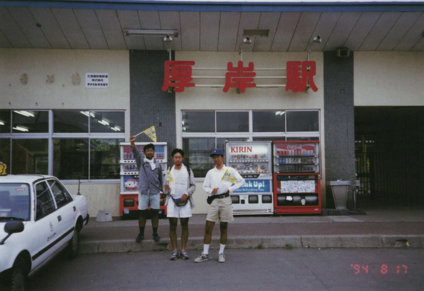苫小牧駅。シャッターを押してくれた人が女の牧師さんで我々にキリスト教に入るよう勧誘するが、あっさり断る。