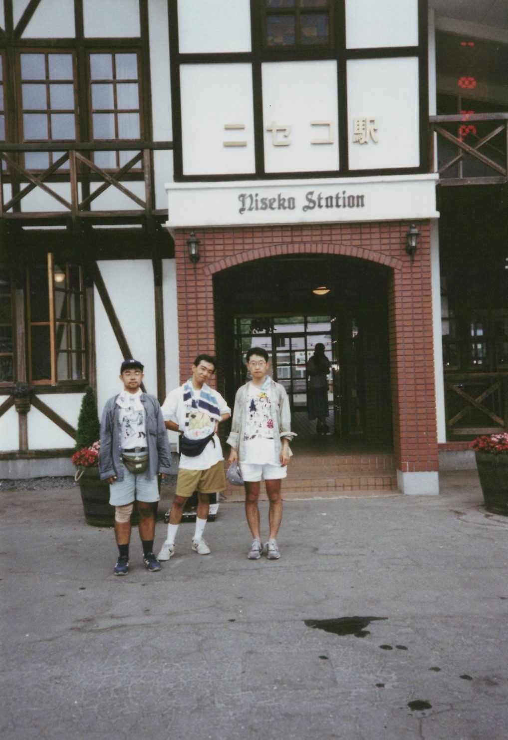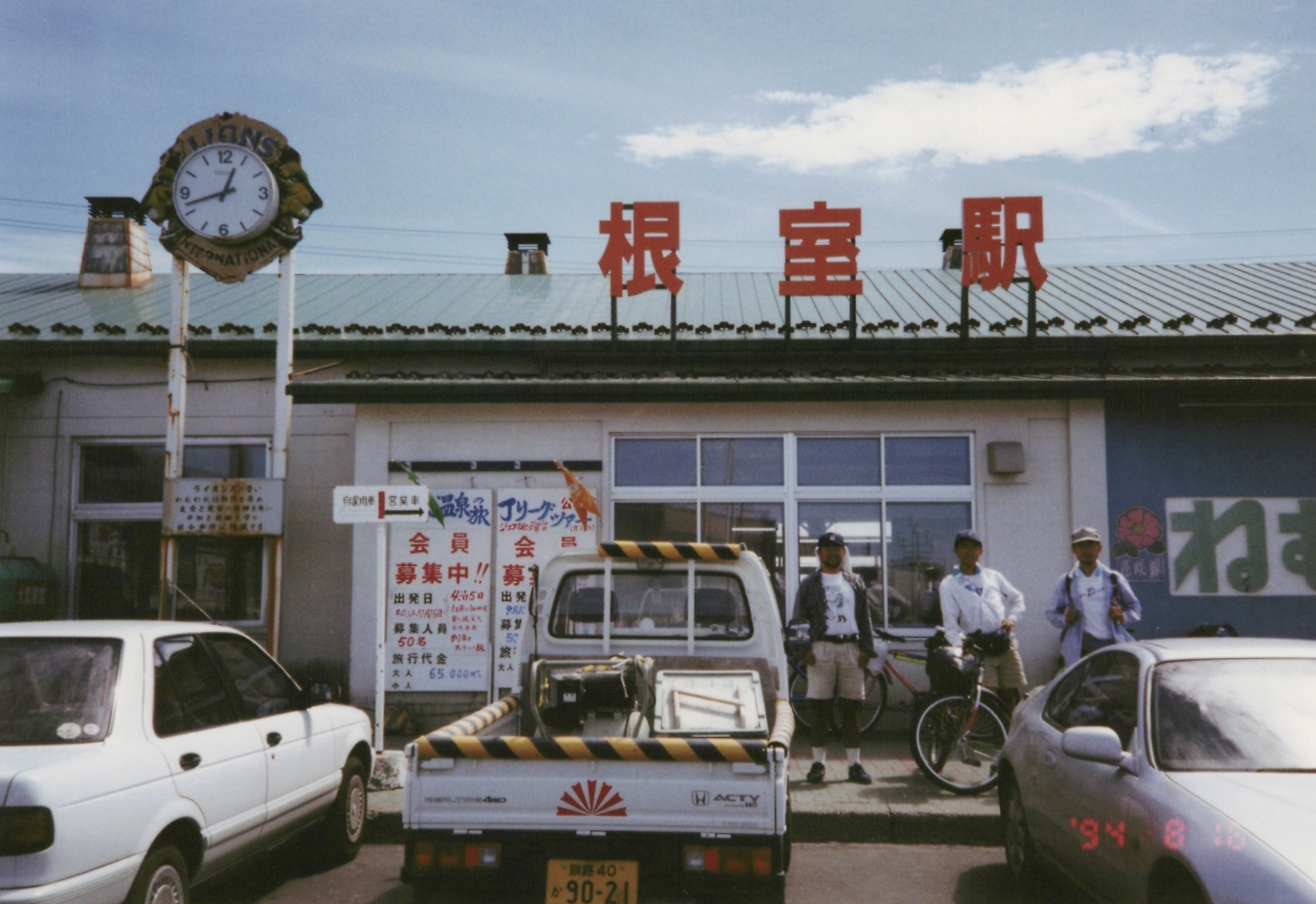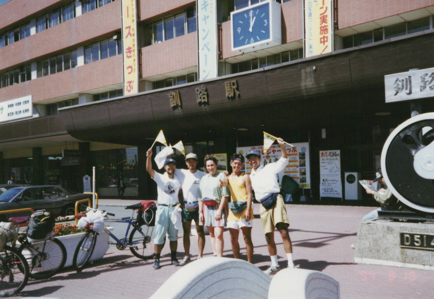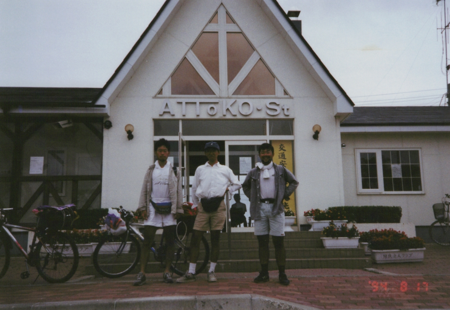 苫小牧駅。シャッターを押してくれた人が女の牧師さんで我々にキリスト教に入るよう勧誘するが、あっさり断る。