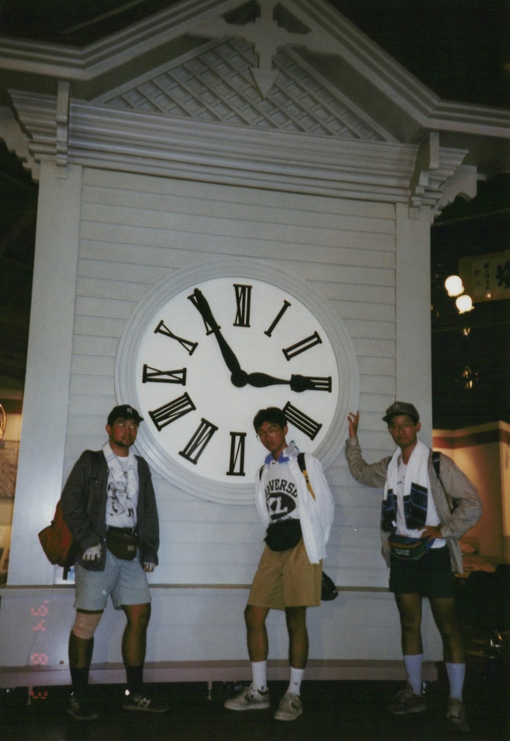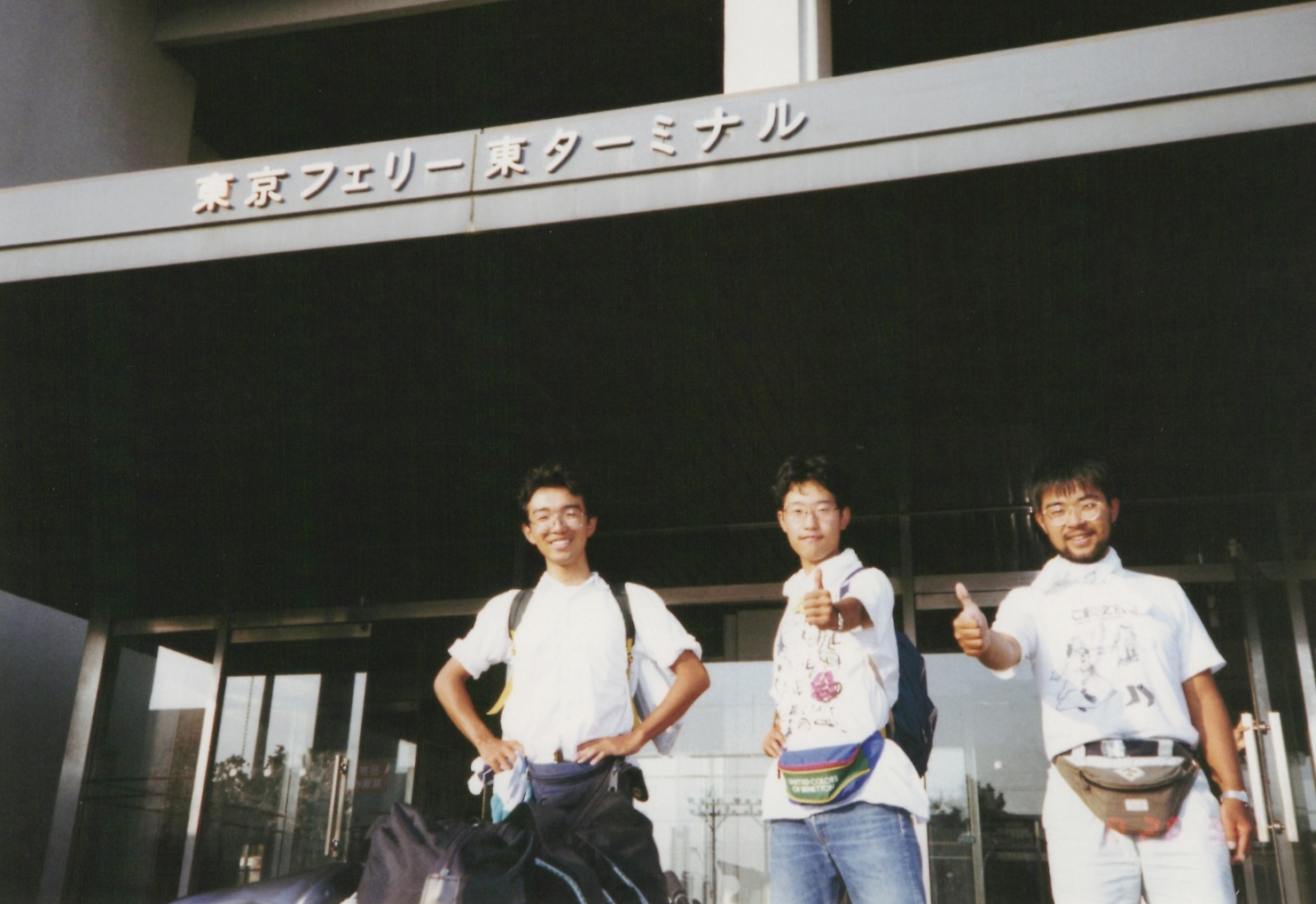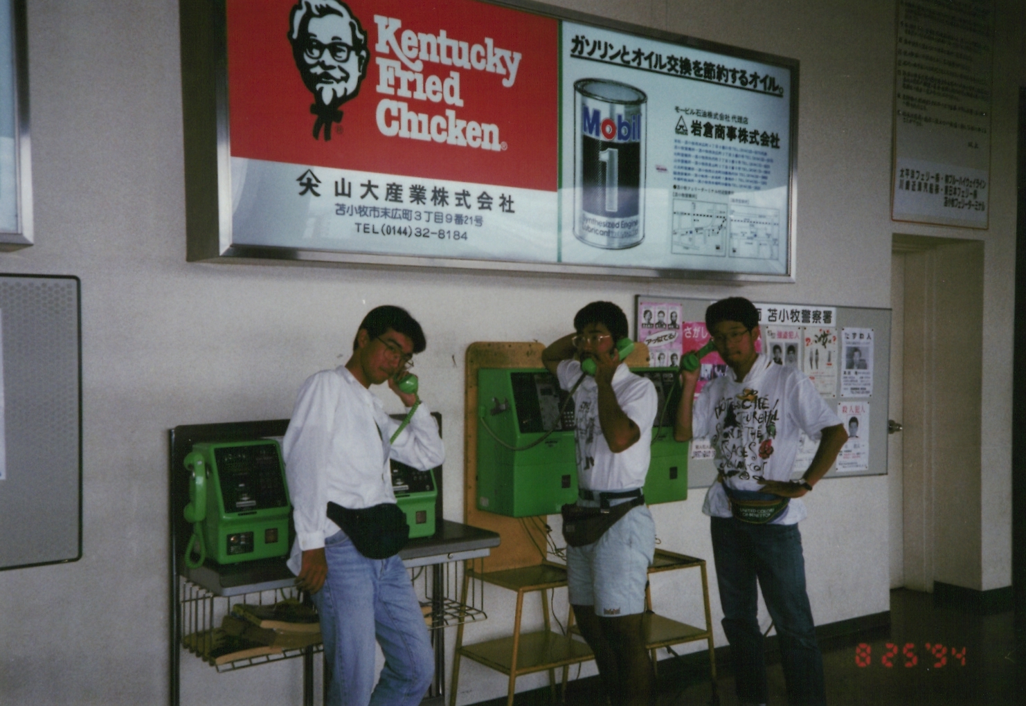3人とも誰にもTELしていません。単なるポーズです。苫小牧フェリーターミナル内にて。売店で3人の記念としてキーホルダーをそれぞれ買う。