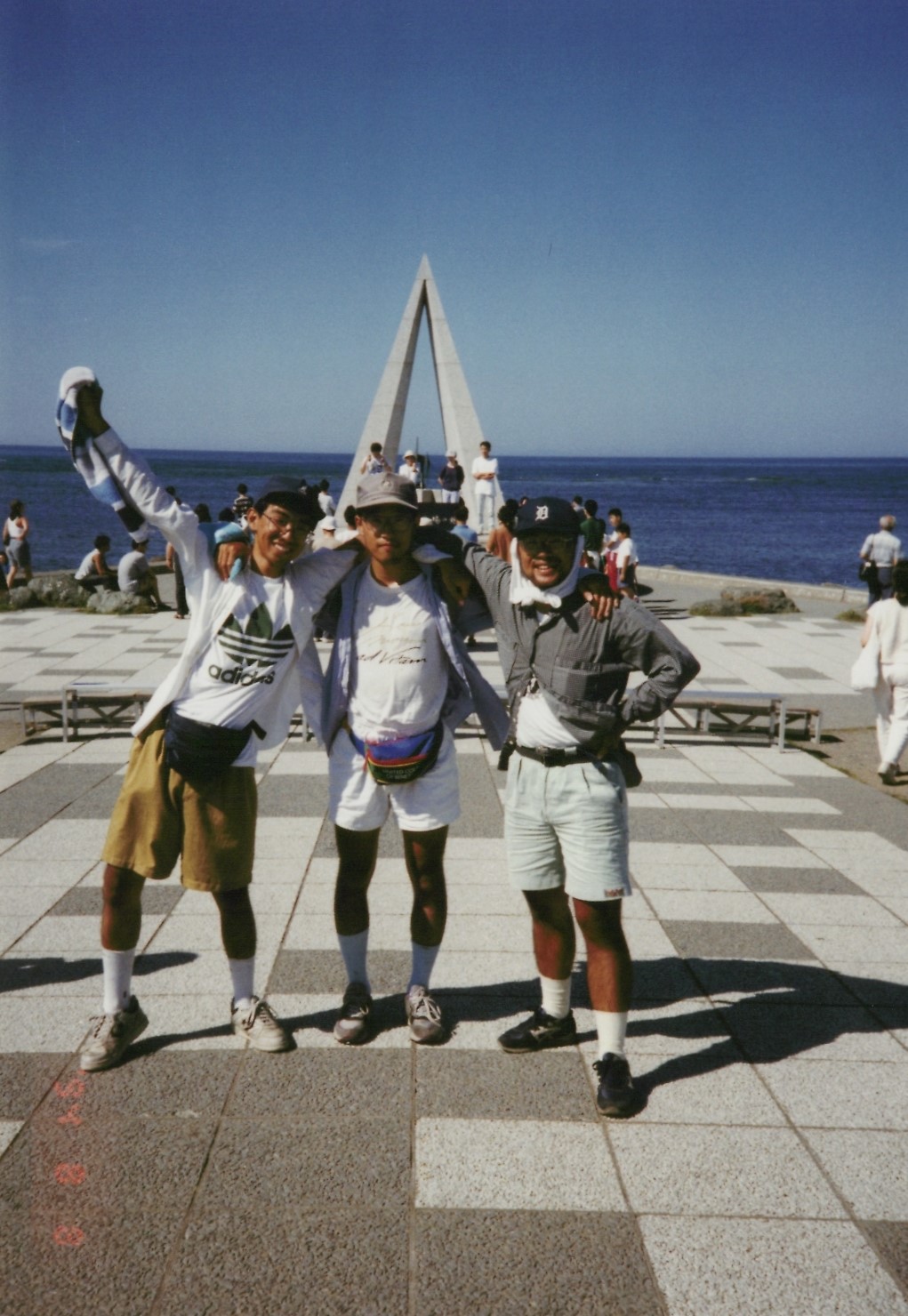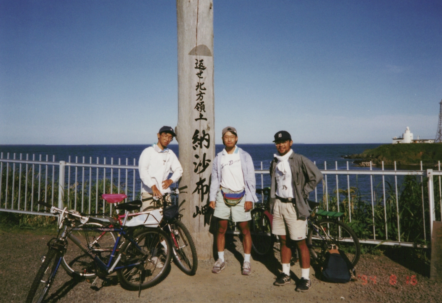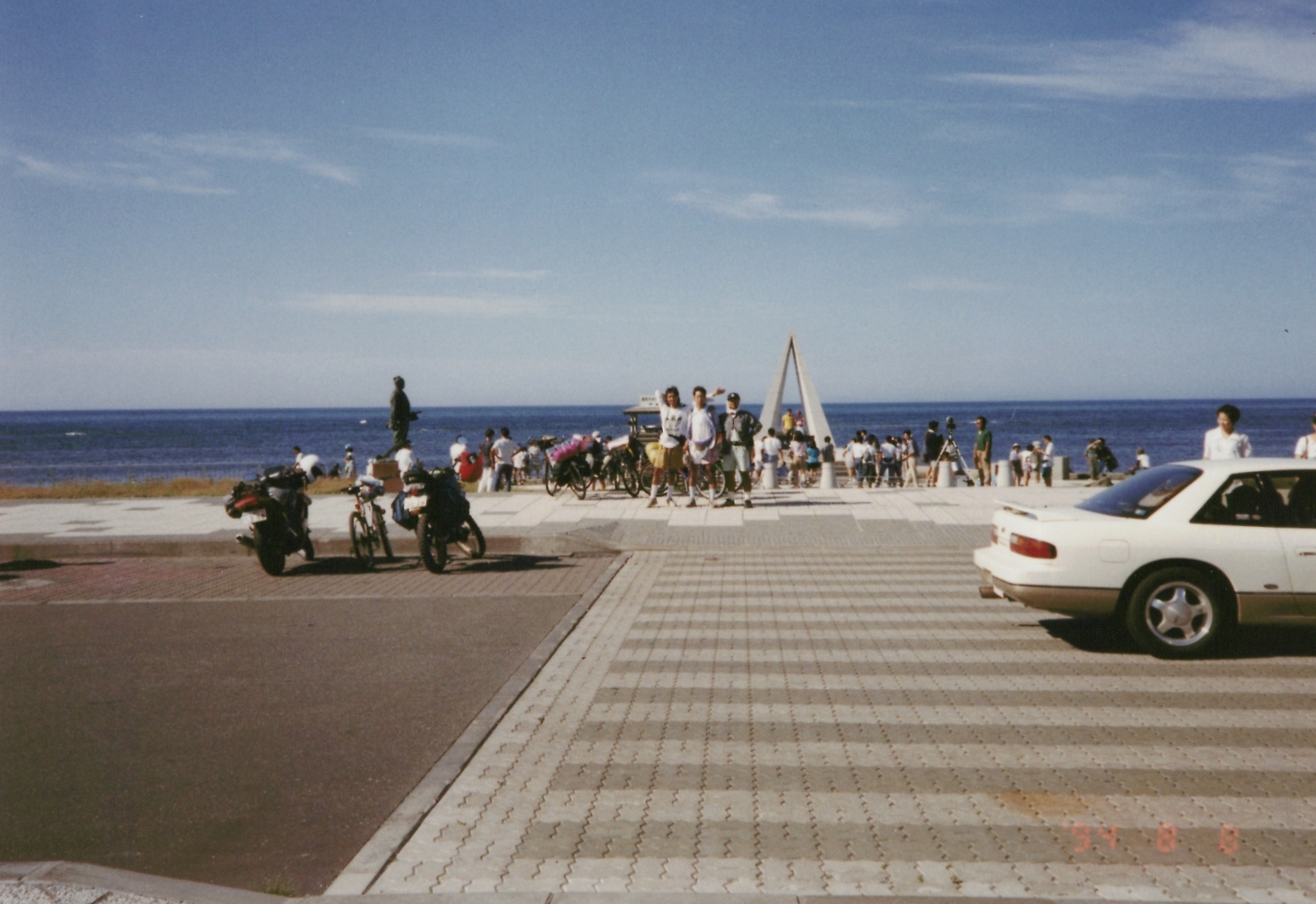 宗谷岬にて。やっと着いたと言いたいよーだ。後ろのモニュメントで写真を撮るのが待ちきれない3人。