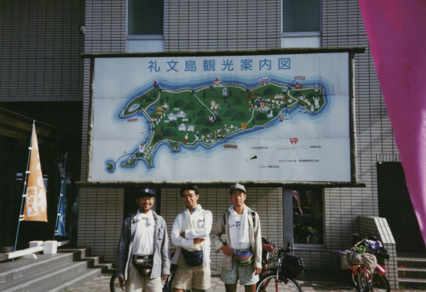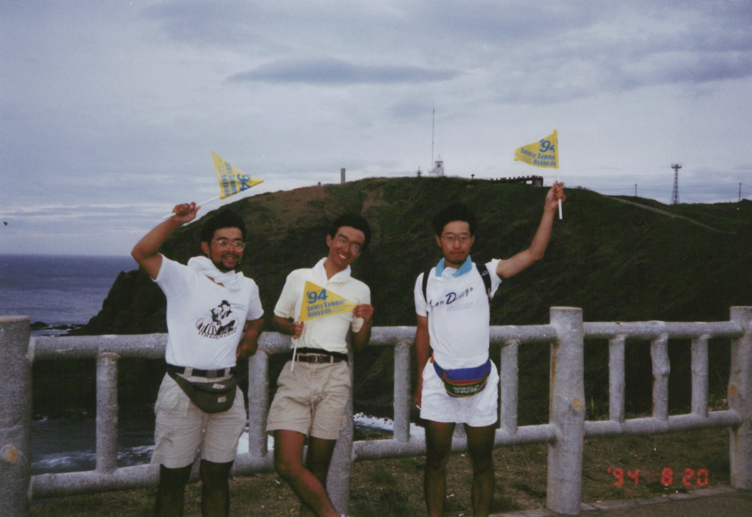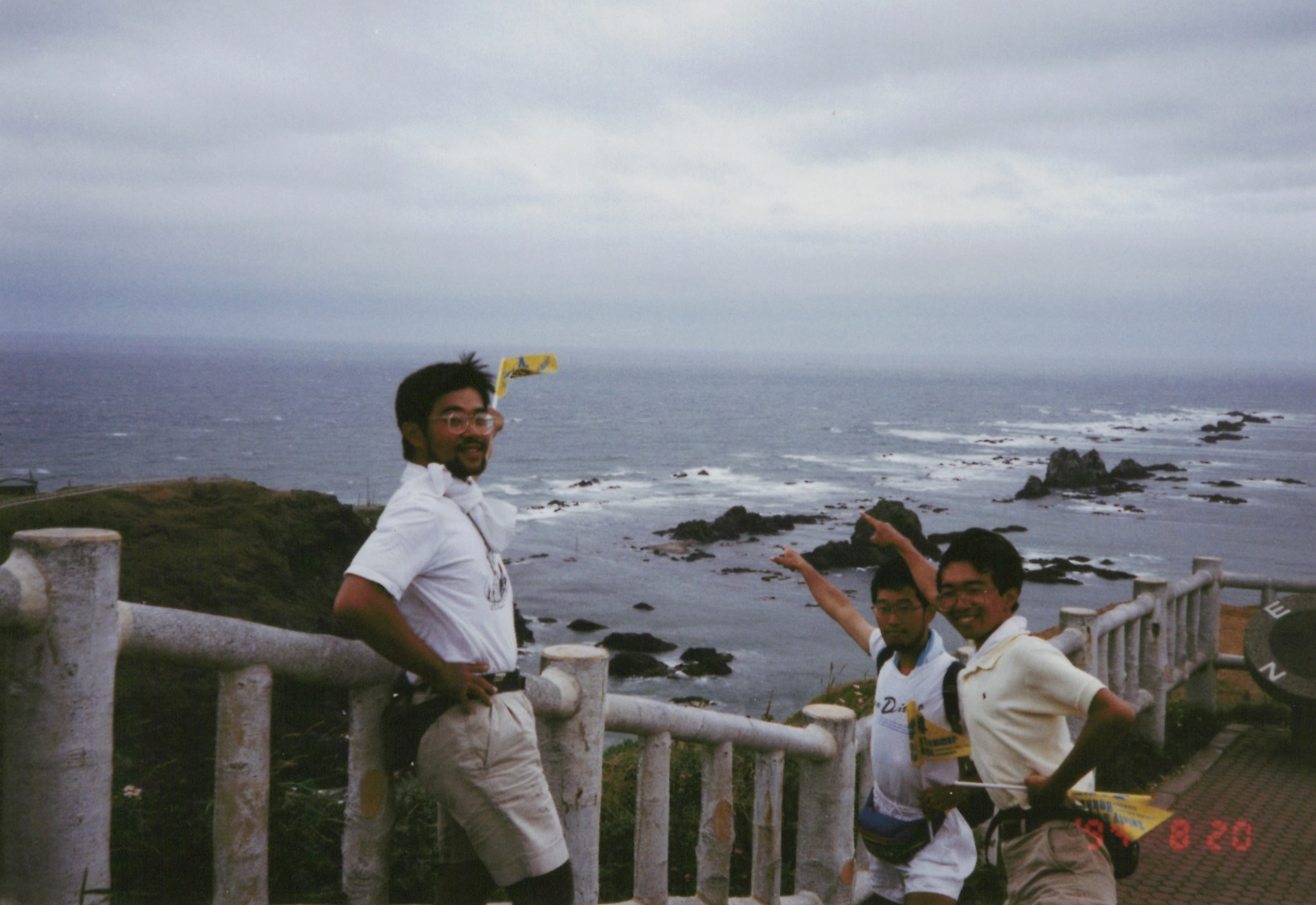 宗谷岬にて。やっと着いたと言いたいよーだ。後ろのモニュメントで写真を撮るのが待ちきれない3人。