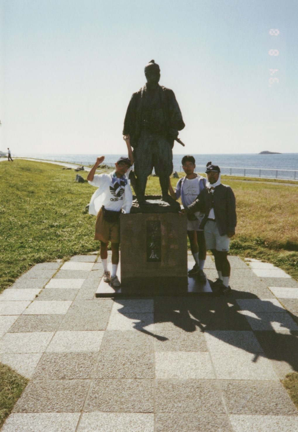 間宮林蔵の像。この写真を撮ってくれた人のグループは皆この像によじ登って記念写真を撮っていた。我々はまともだなぁ。