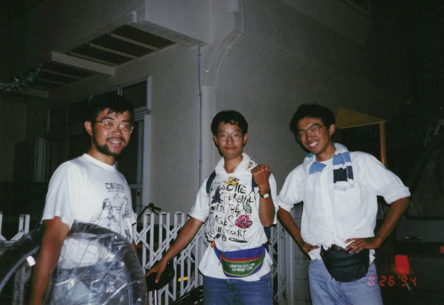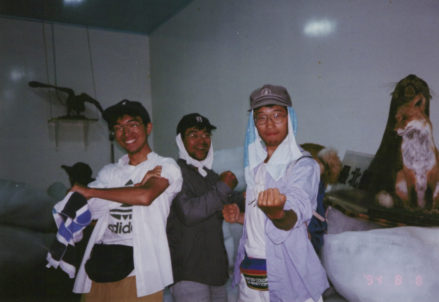 隠ちゃん邸の前にて。隠ちゃんの髭が今回の旅の長さを窺わせる。ちなみに野々垣と私は口ひげを生やしている。