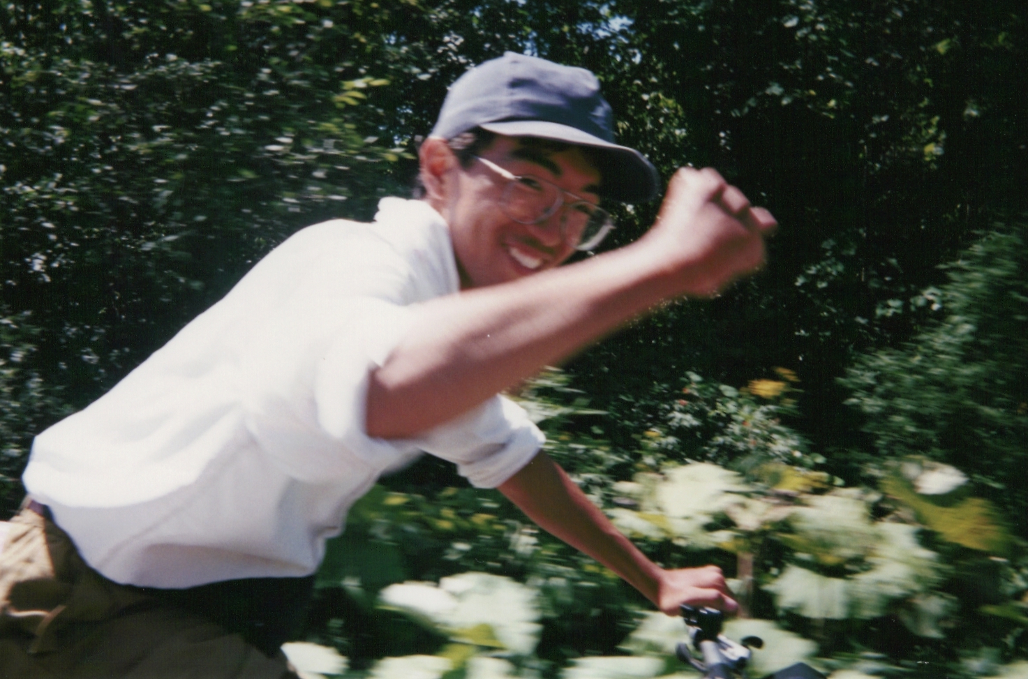 私は突撃のポーズをとっている。ちなみに、手前の自転車が私の愛車である。