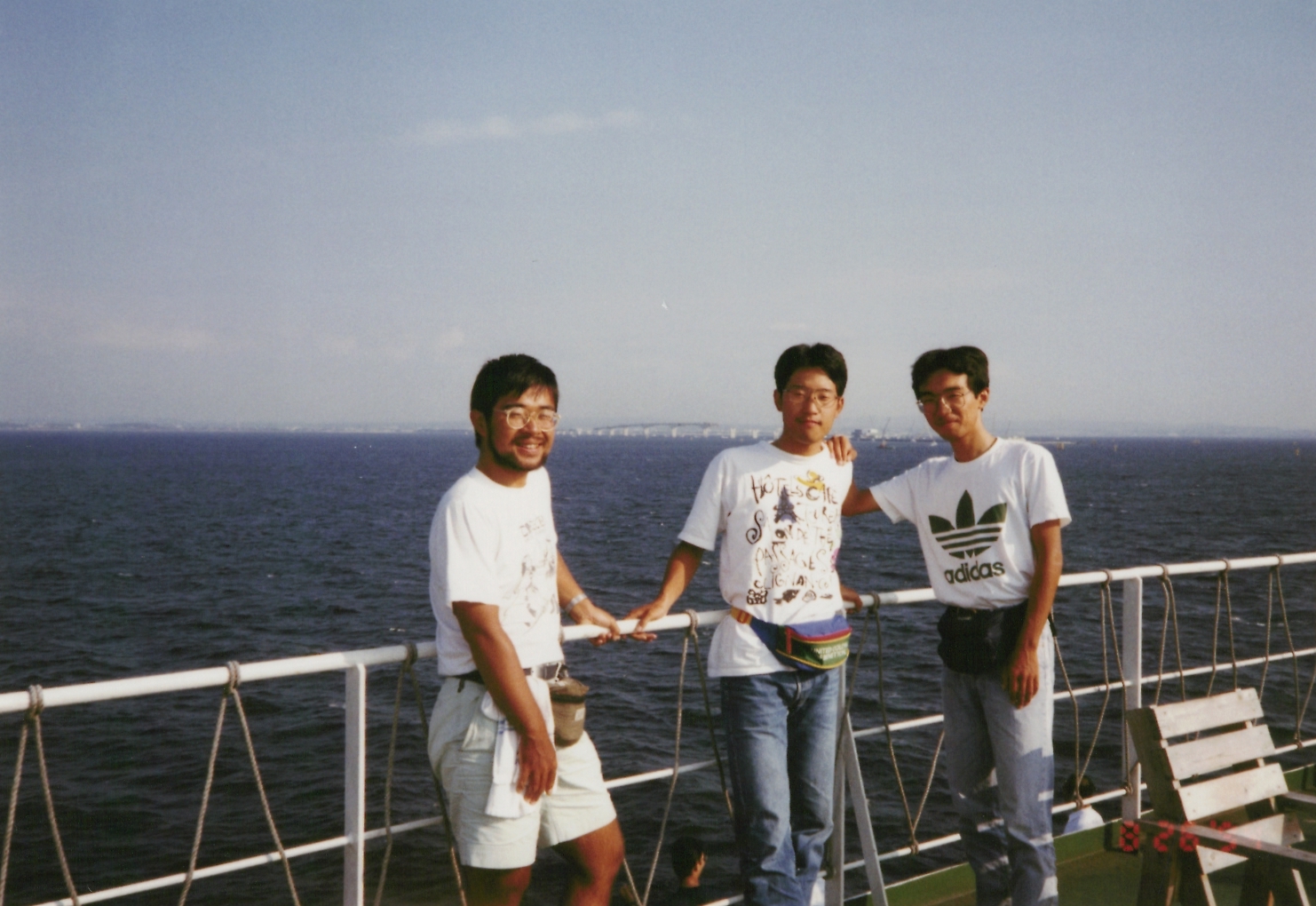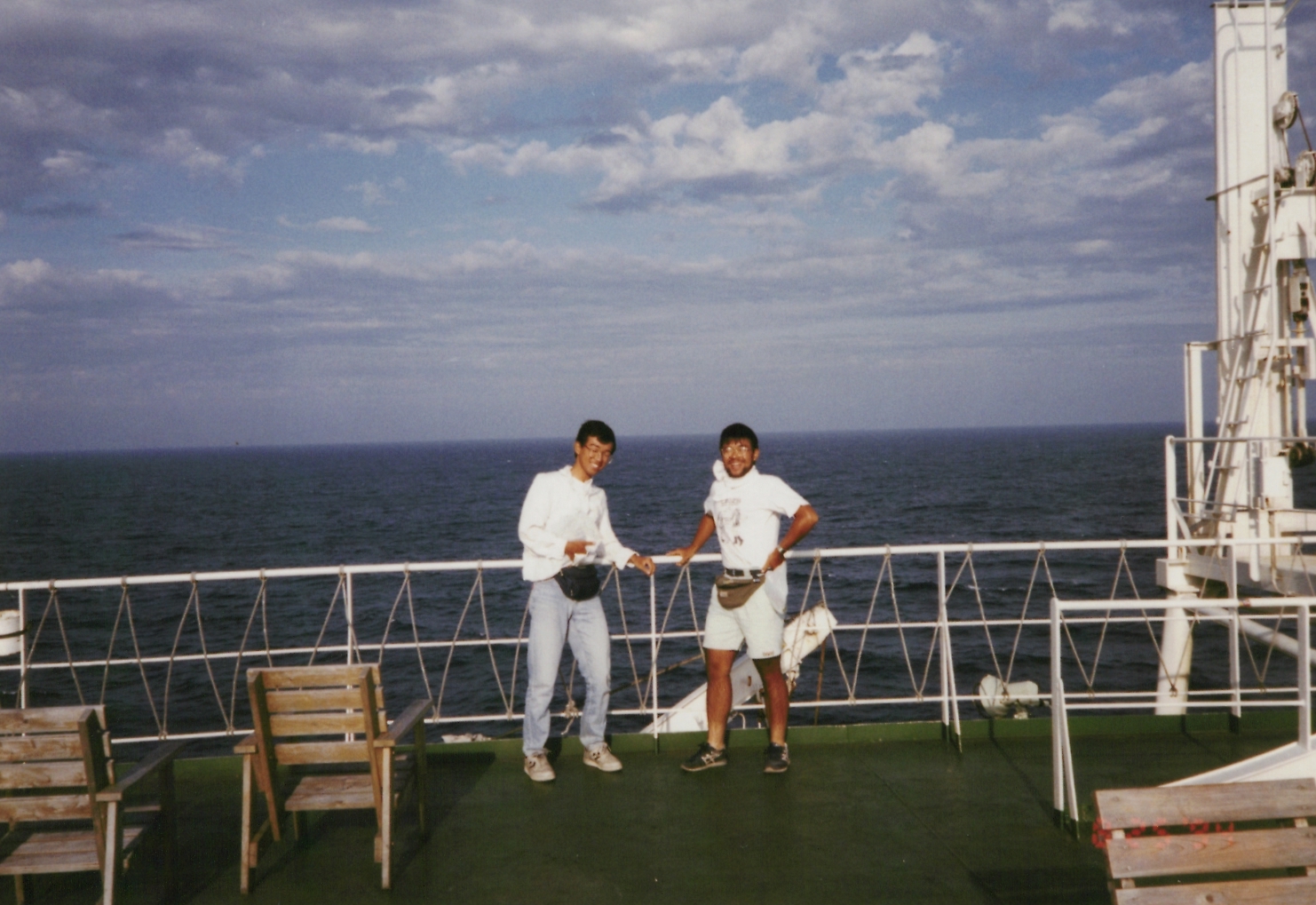フェリーの甲板。もう北海道は見えない。野々垣君、船酔いでダウン。海風が強い。