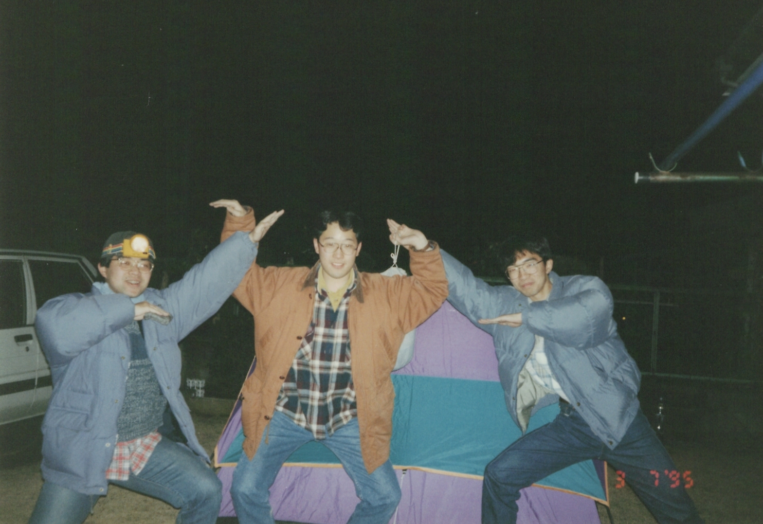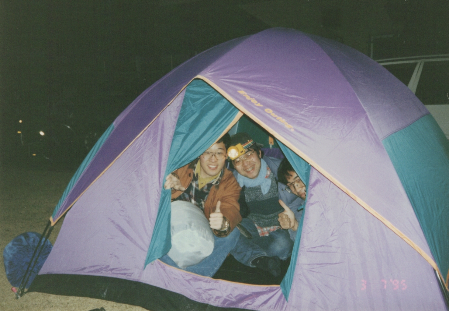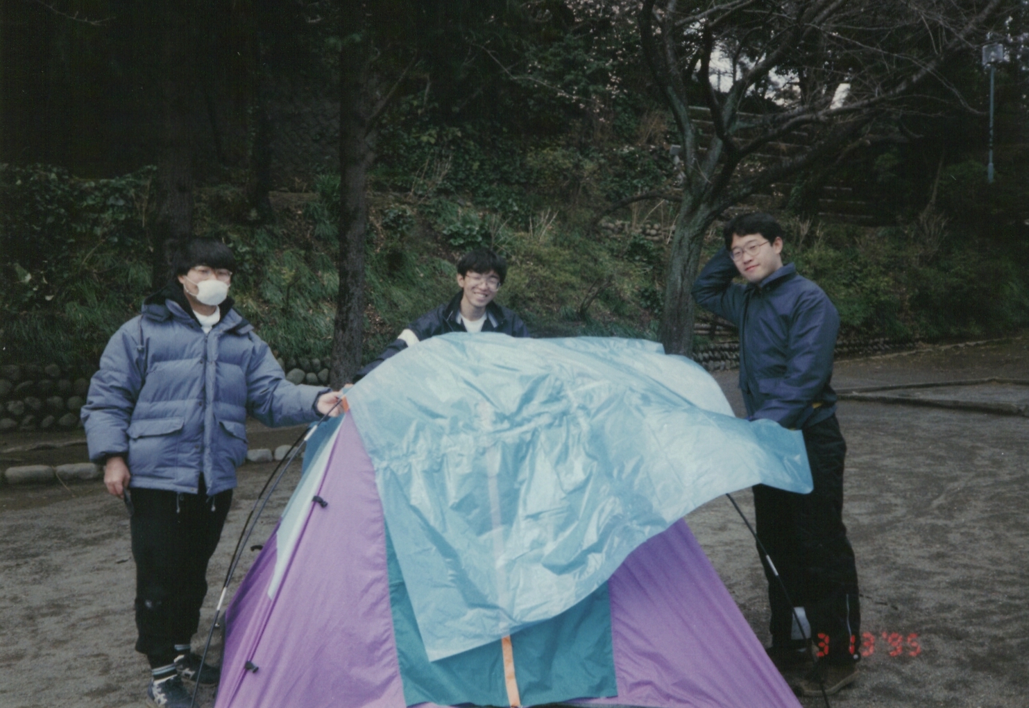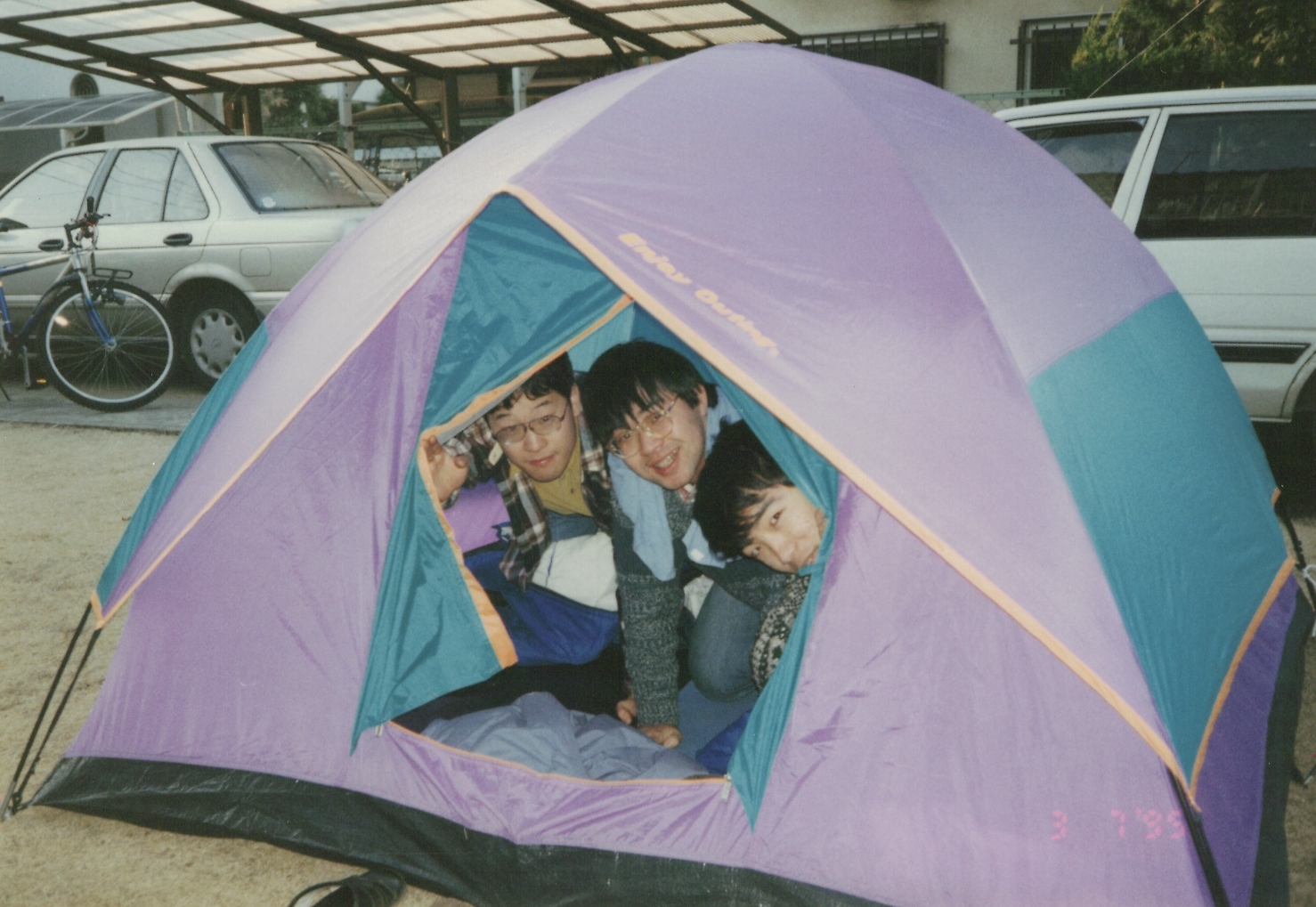 家の中で隠ちゃん持参のウィスキーを軽く1杯ひっかけ、意気揚々とテントに入る我々3人。外はちょっと(?)寒い。