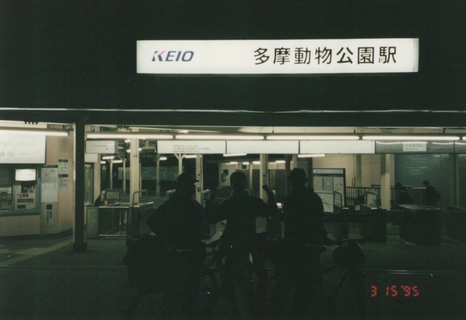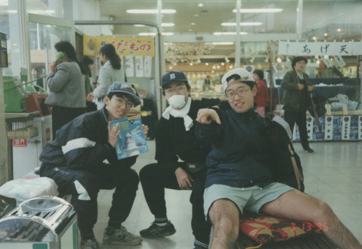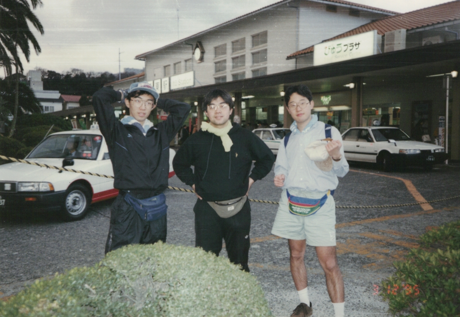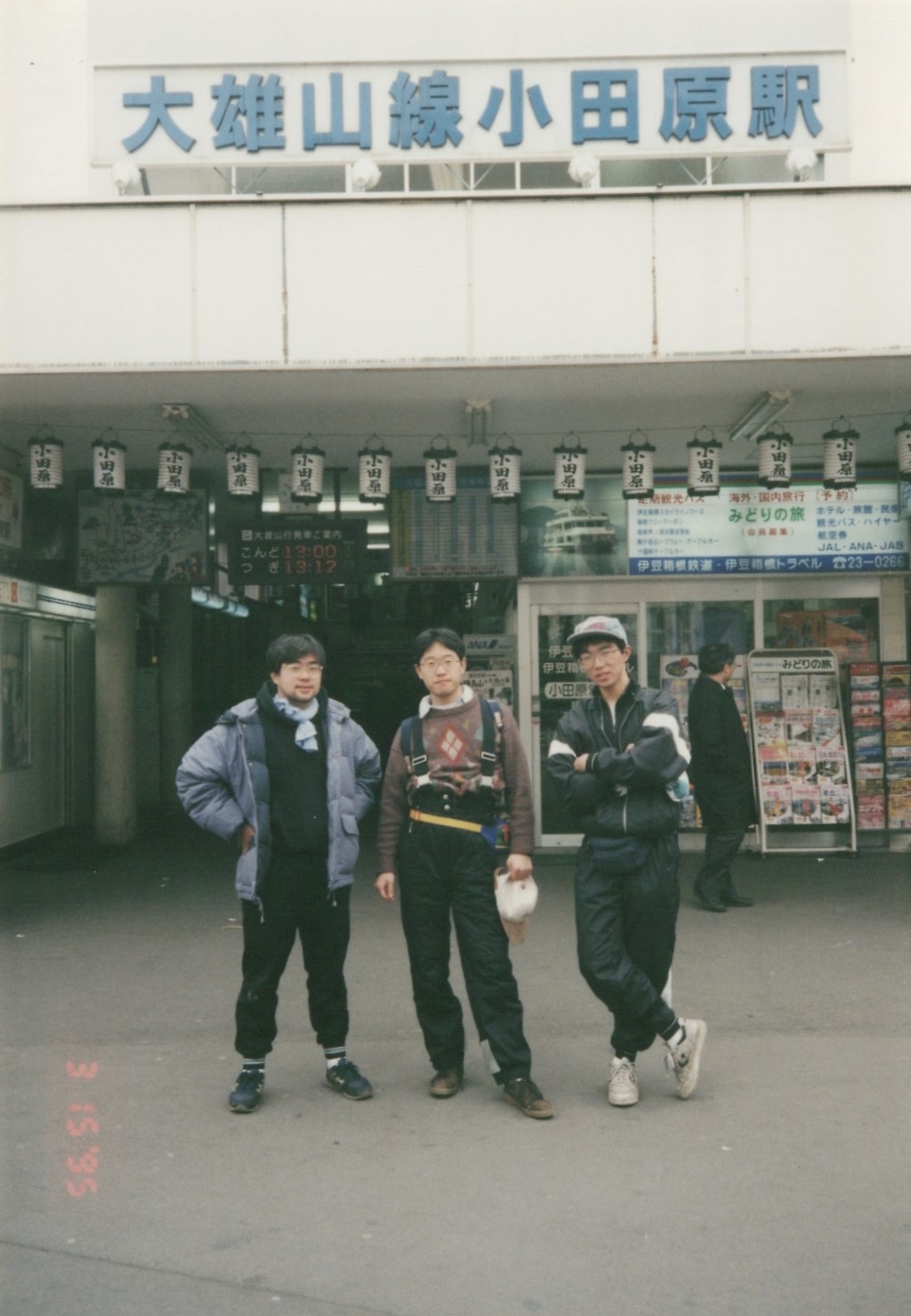 修善寺駅の中。ほんのひと時の休息を楽しんでいる。野々垣氏の帽子の傾き具合が道中の疲労を物語っている。
