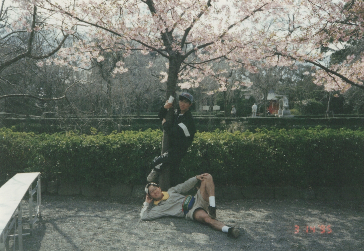 予定では伊豆を一周するものであったが、シートの完成、シェラフ、テントが乾いた後、修善寺へ向かうことに決めた。とりあえず伊東公園を去る前に桜をバックに記念撮影。昼飯はかつ丼を食べました。