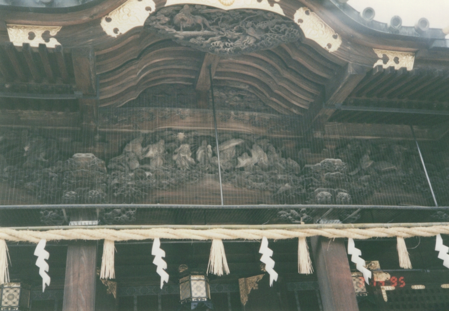 神社本殿に飾られた彫り物。須佐之男命(スサノオノミコト)が岩戸を開け、天照大御神が姿を現すシーンであると、案内役の人が説明していた。