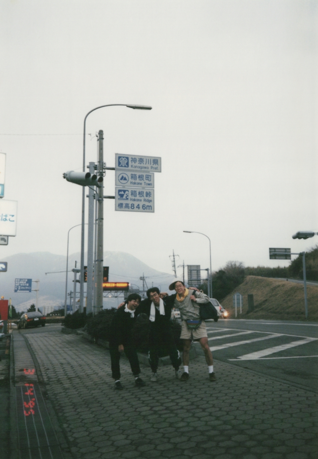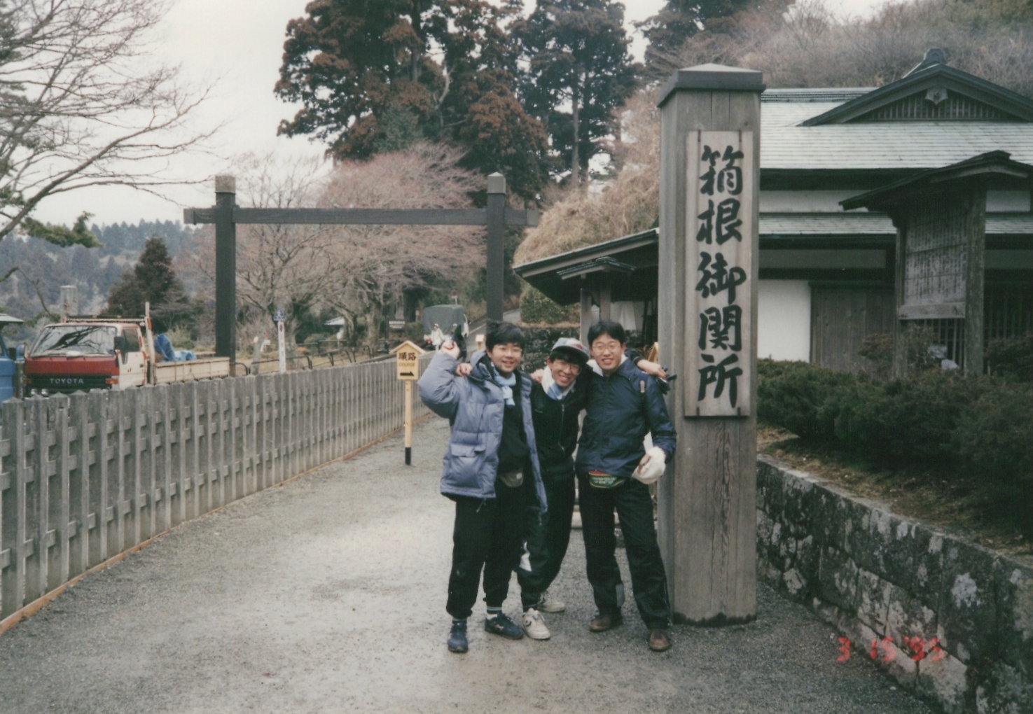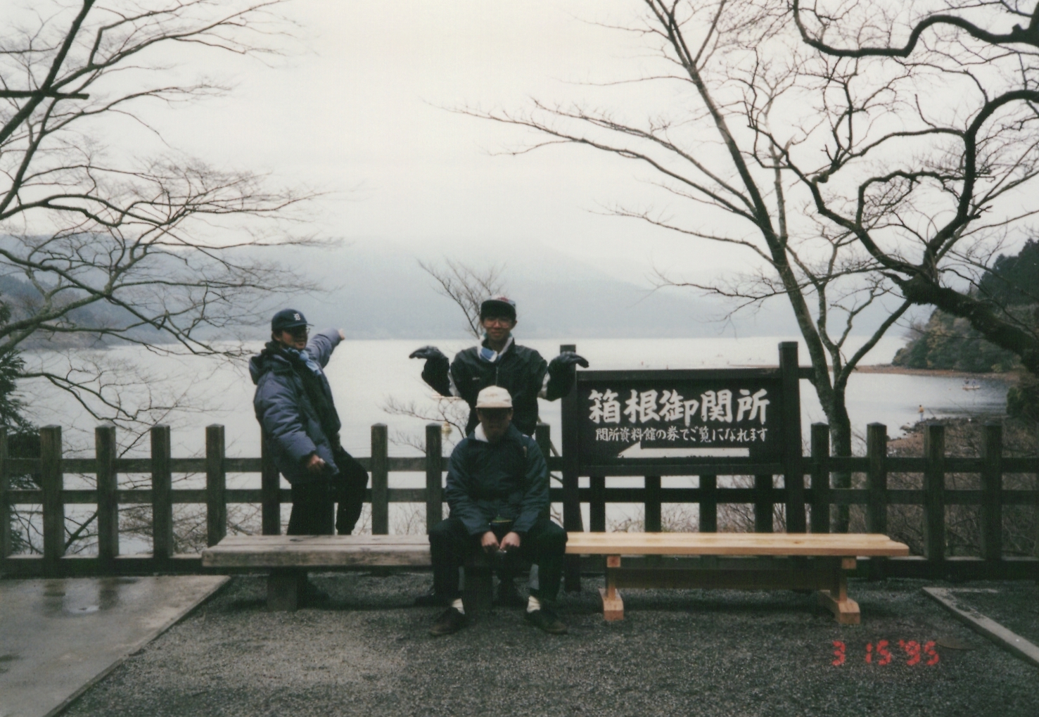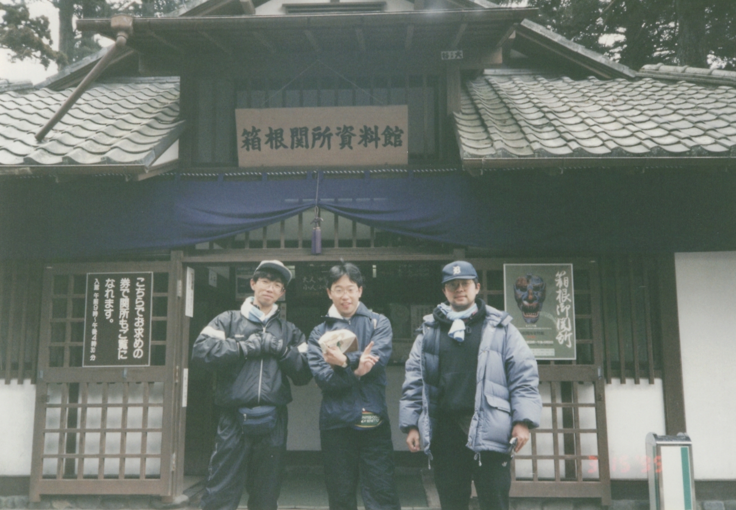テントを畳み、箱根の関所を見学。天候はくもり。この写真では分からないが、私の尻には昨夜の貼るホカロンが付いたまま。知っていたらこんな笑顔は見せられない。