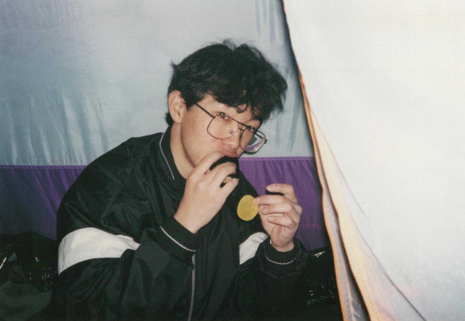 次の旅まで誰がテントを保管するかを「あみだくじ」で決め、運よく(?)隠ちゃんが権利(義務ともいう)を引き当てる。青い紙がその「あみだくじ」。隠ちゃん無念の表情。