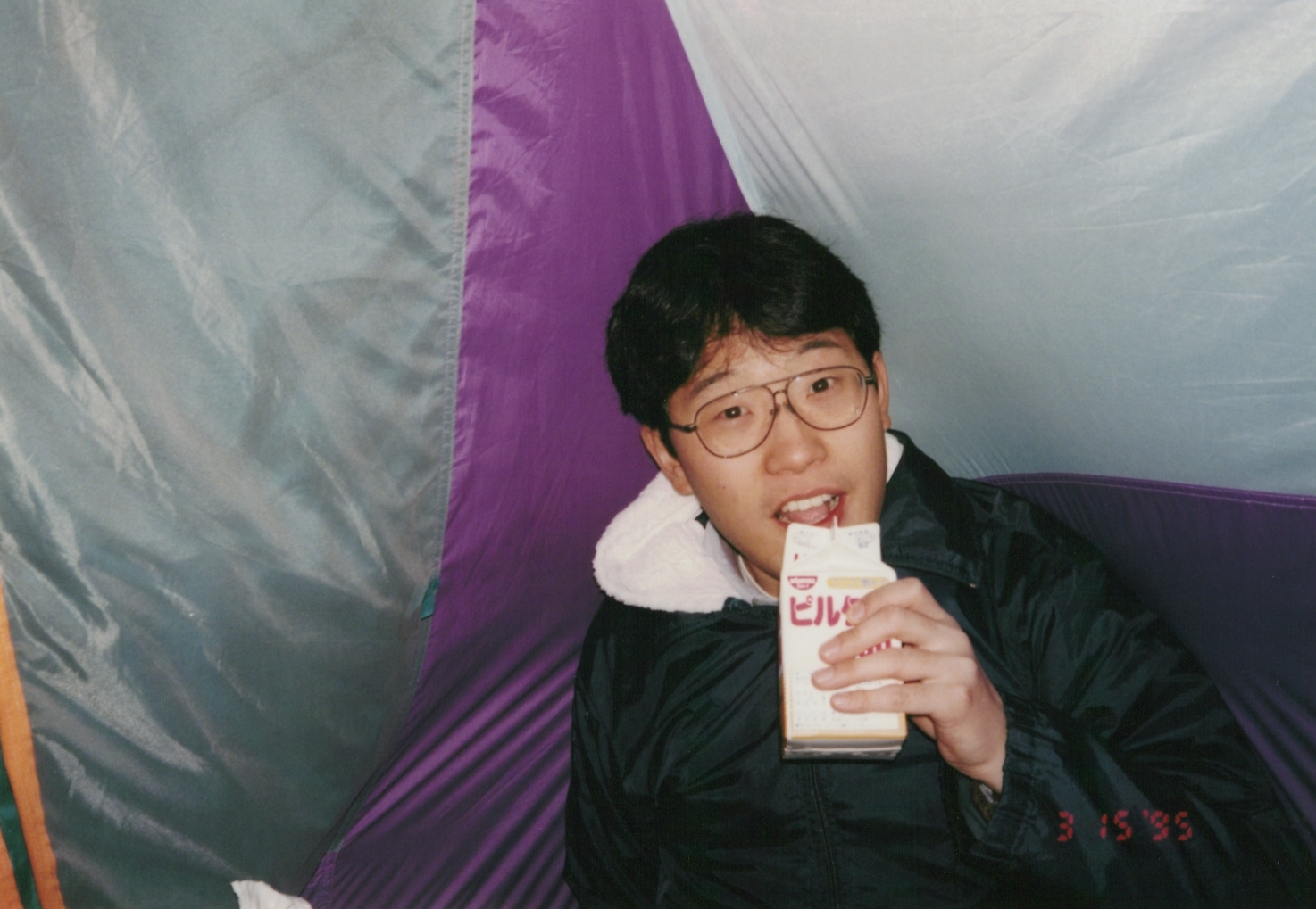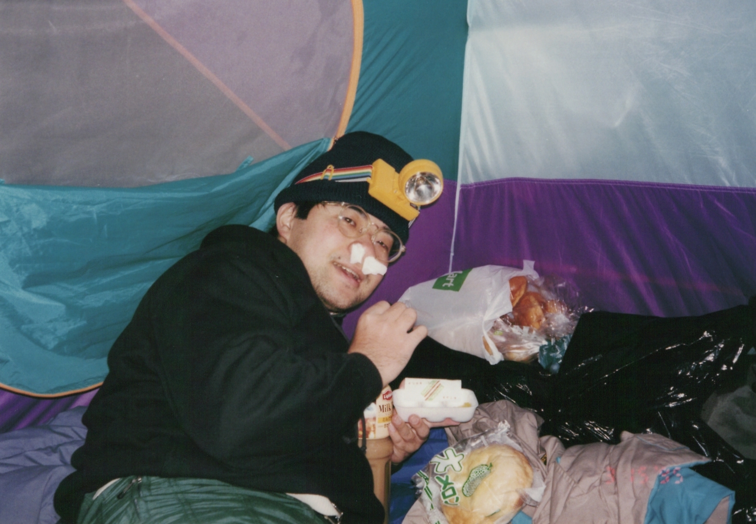 野々垣氏もお疲れ。ちなみに、この写真はテントの中である。袖を見れば分かるが、ずいぶん厚着。テントの外にはまだ雪が残っている。
