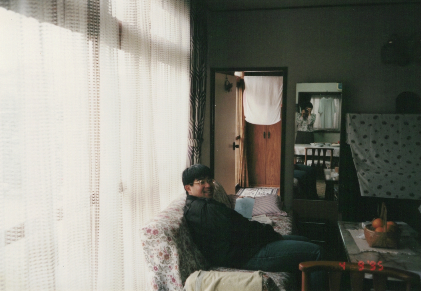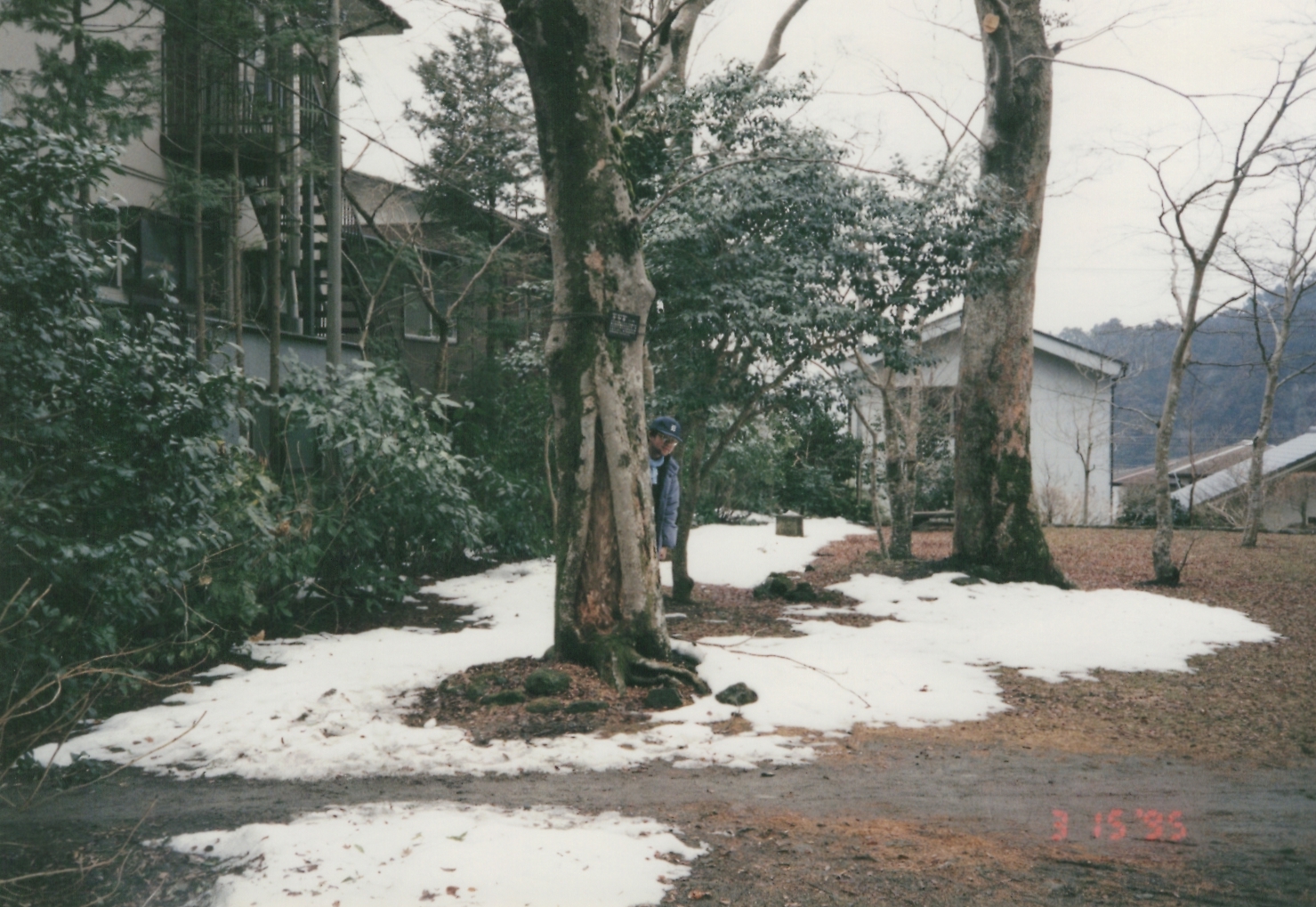数日後(もう4月に入っている)日記の残りを書くためと、テントのシート(伊東での続き)を作るため集合。(我が家の庭にて)