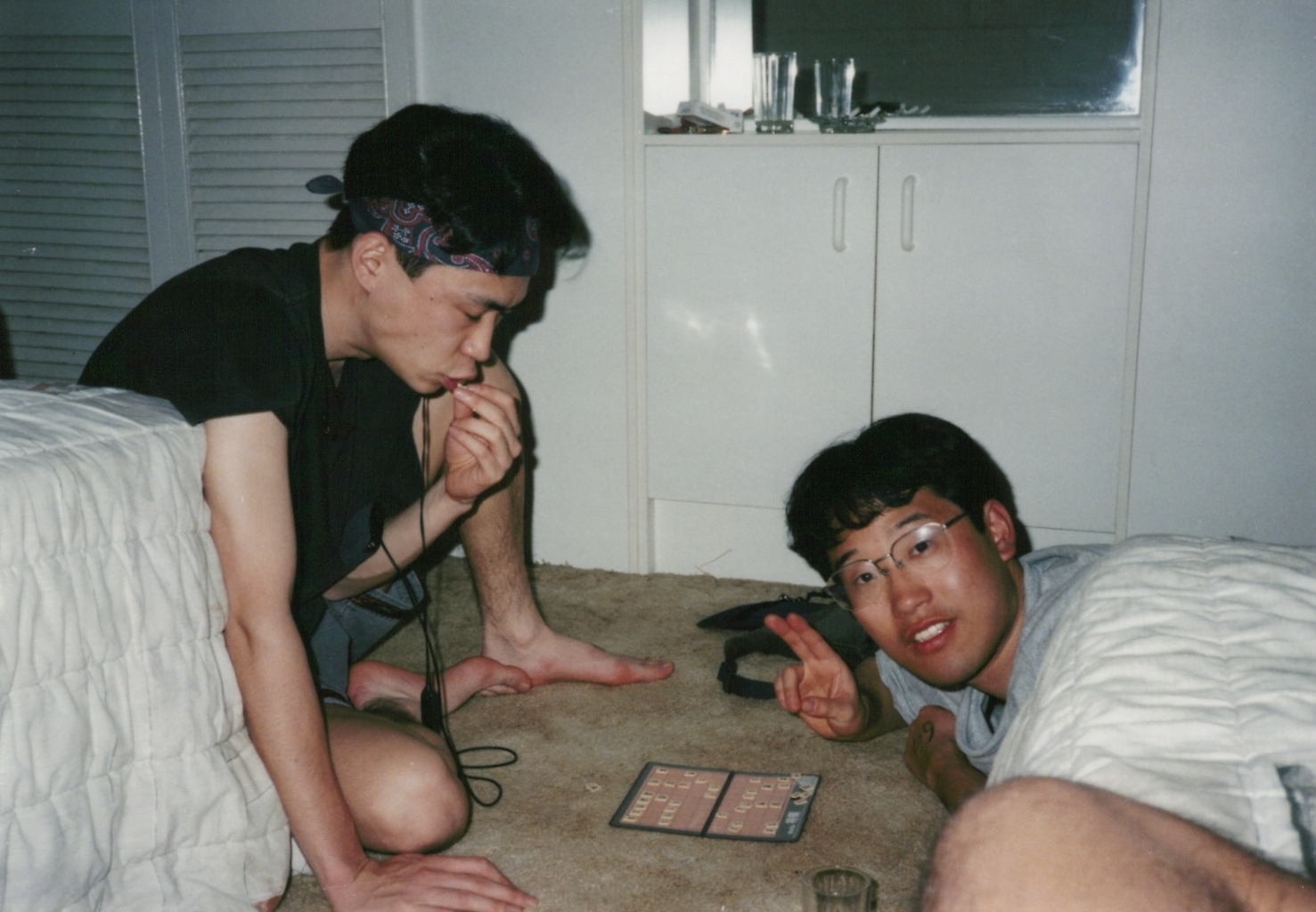 ベッドを賭けたジャンケンに勝ち、ご満悦の野々垣。