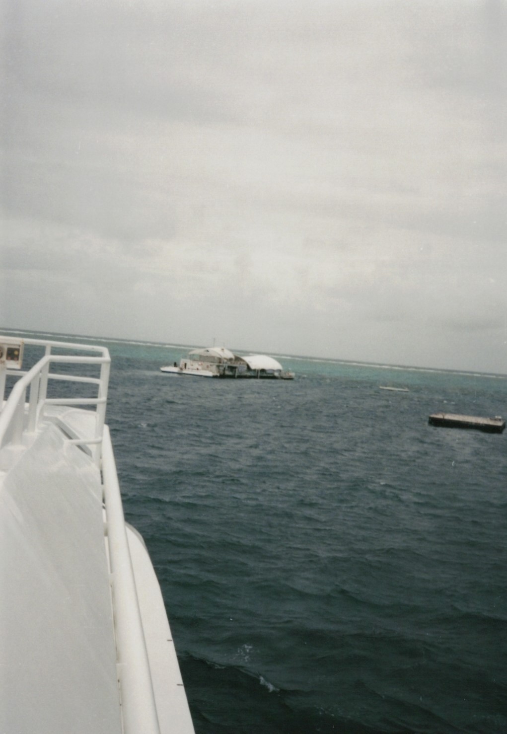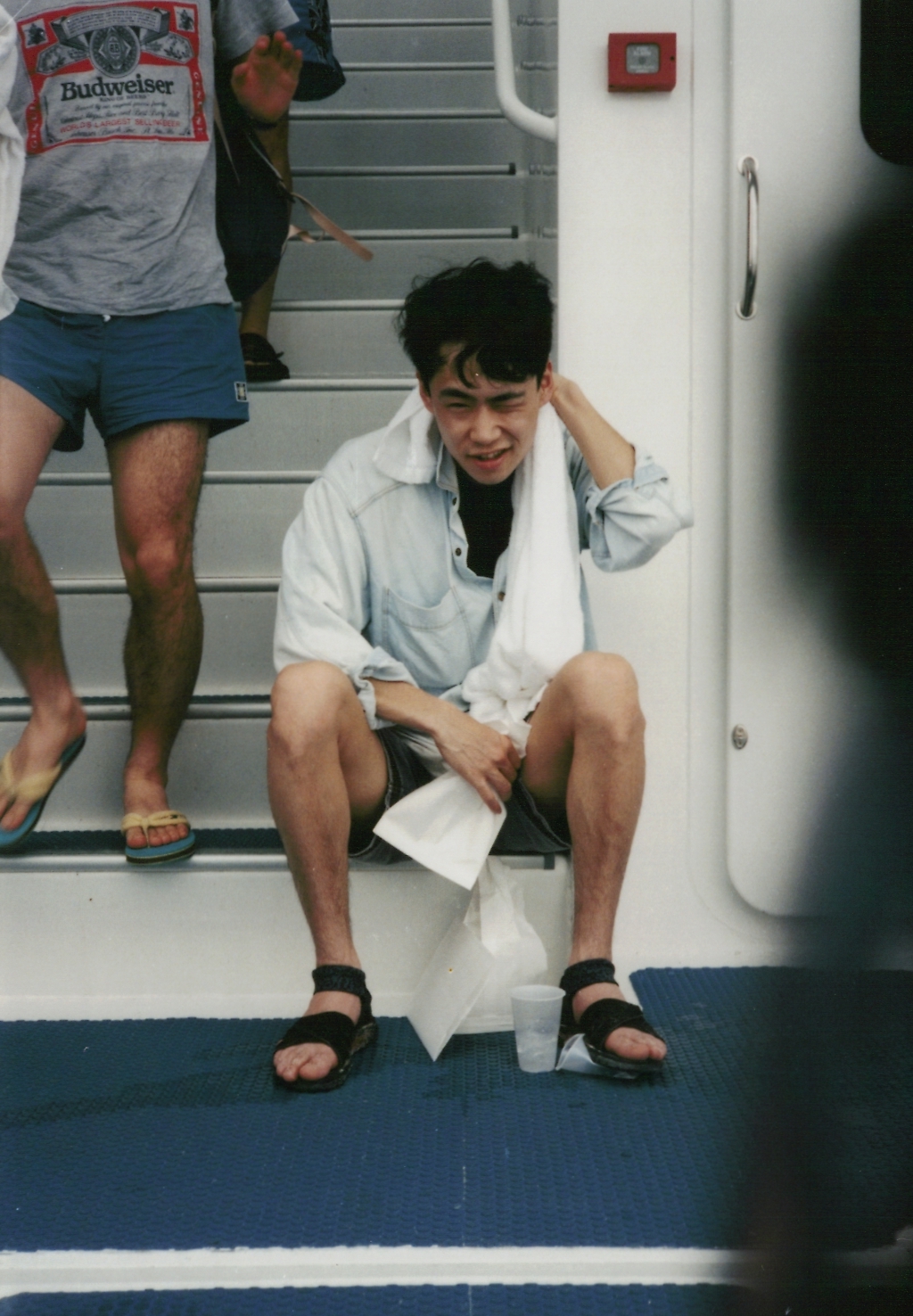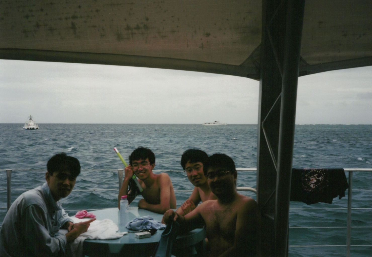 西村、再び船に乗ったおかげで、グリーン島で若干回復した体調も再び悪化。西村の左側、胸から下が写っているのは、野々垣です。