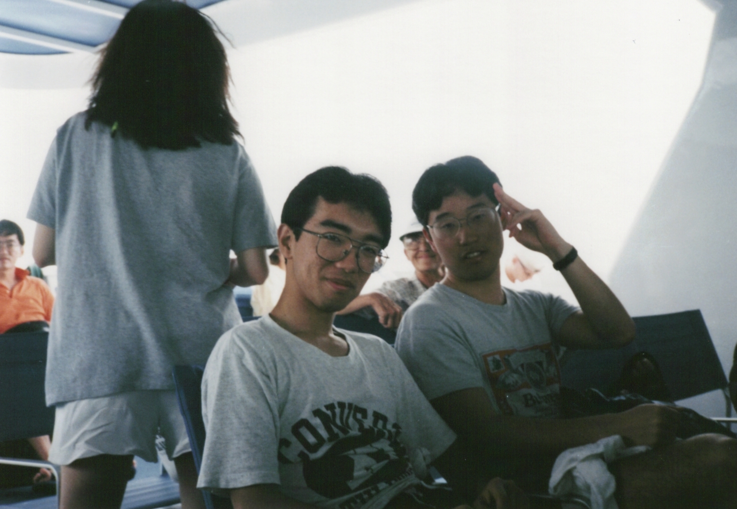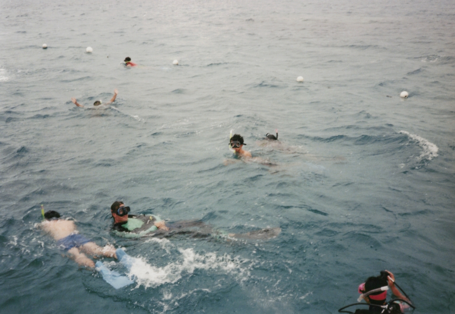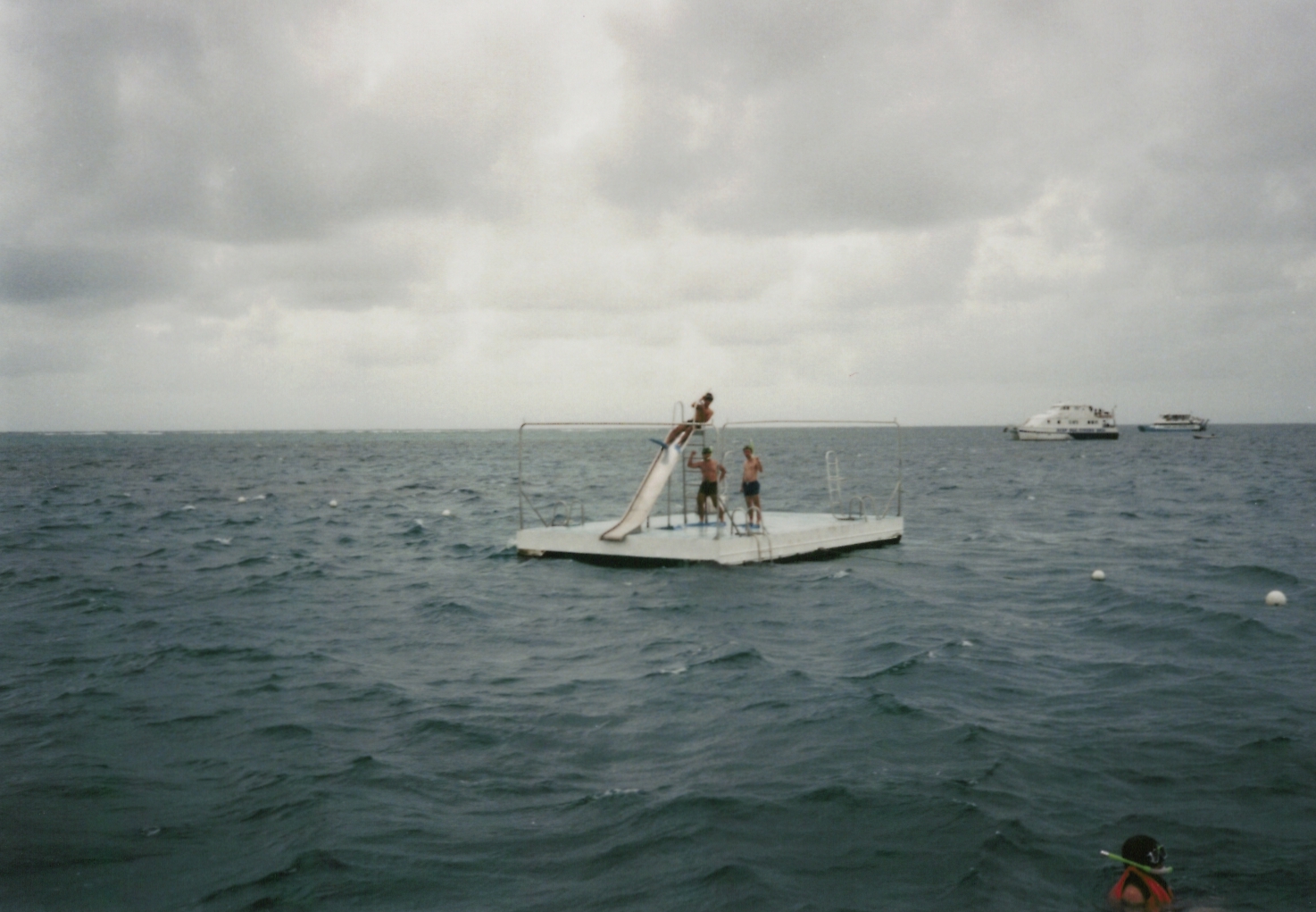 西村、再び船に乗ったおかげで、グリーン島で若干回復した体調も再び悪化。西村の左側、胸から下が写っているのは、野々垣です。
