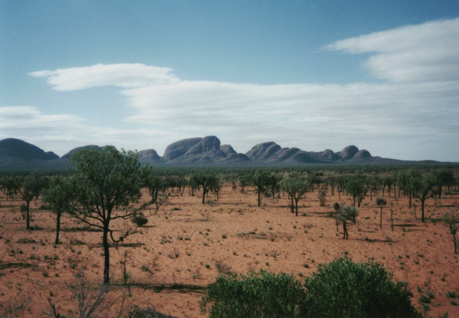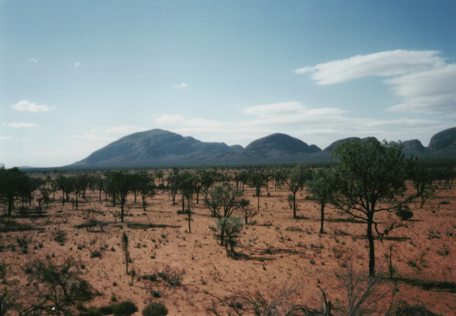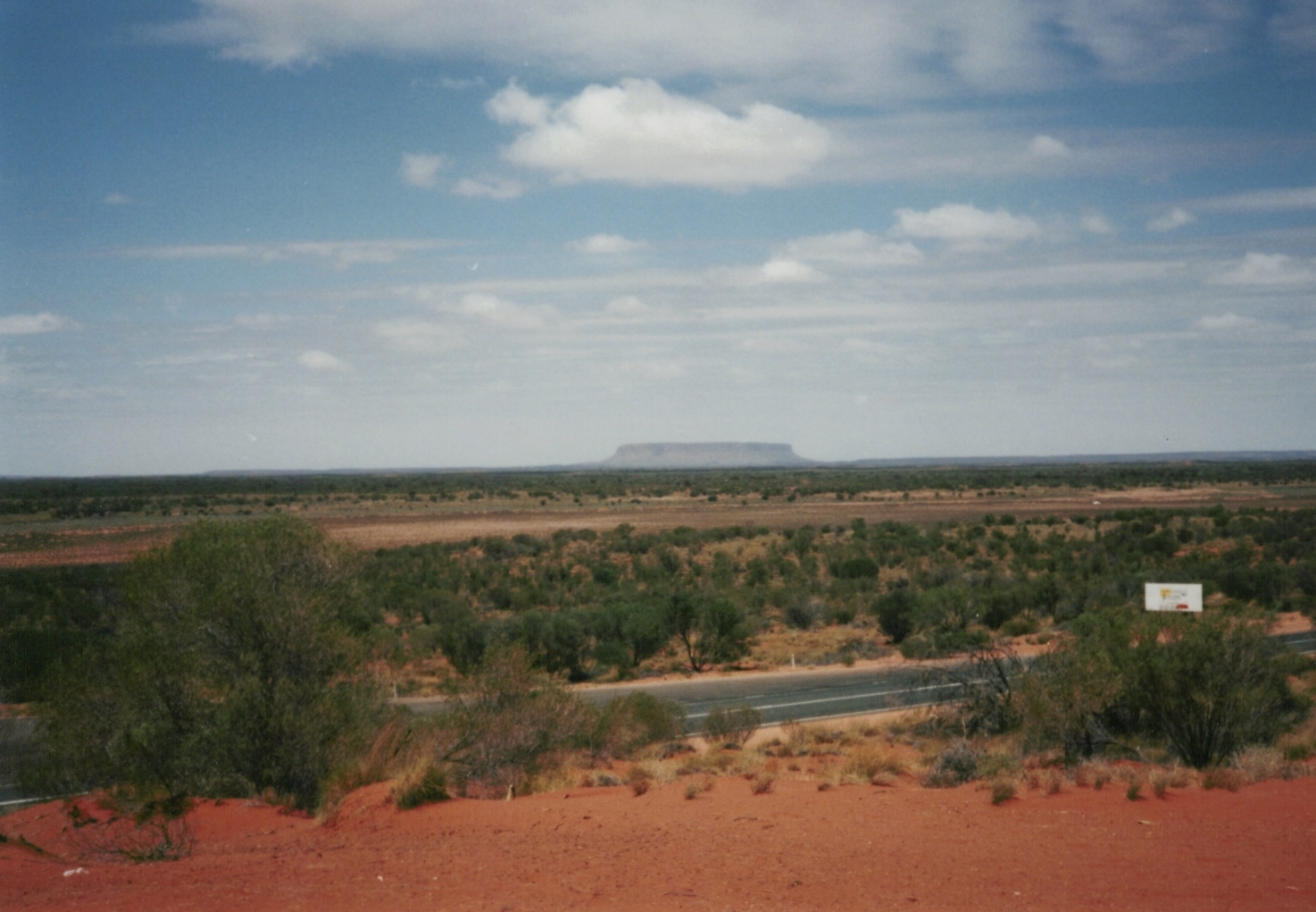 マウントオルガが見えます。マウントオルガは、エアーズロックから西に約30キロ、エアーズロック・リゾートから、約50キロの位置する。エアーズロックのウルルと同様、以前はマウントオルガと呼ばれたが、1995年にアボリジニの正式な呼び方、カタジュタに名前が改められている。