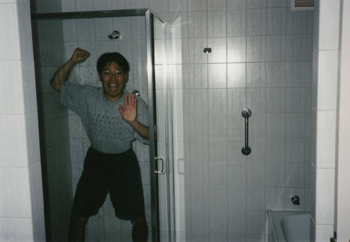 前のホテルと違ってシャワー室もあります。はしゃぐ野々垣。