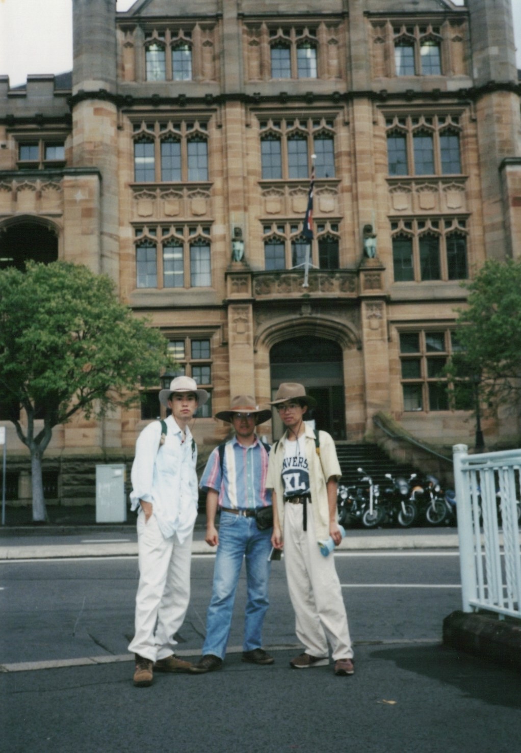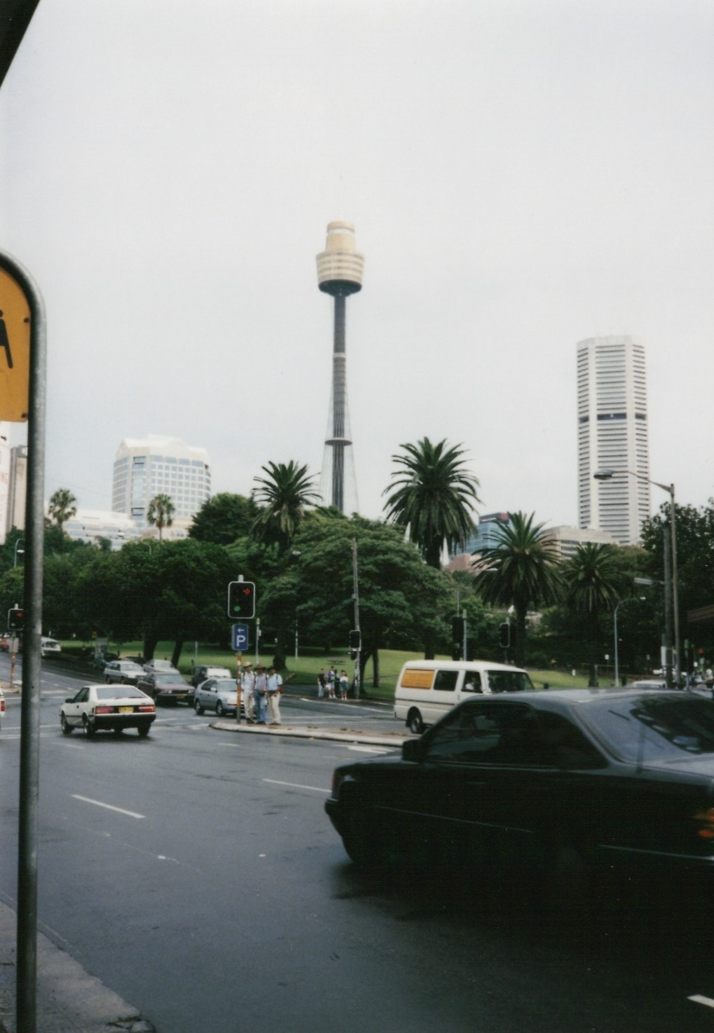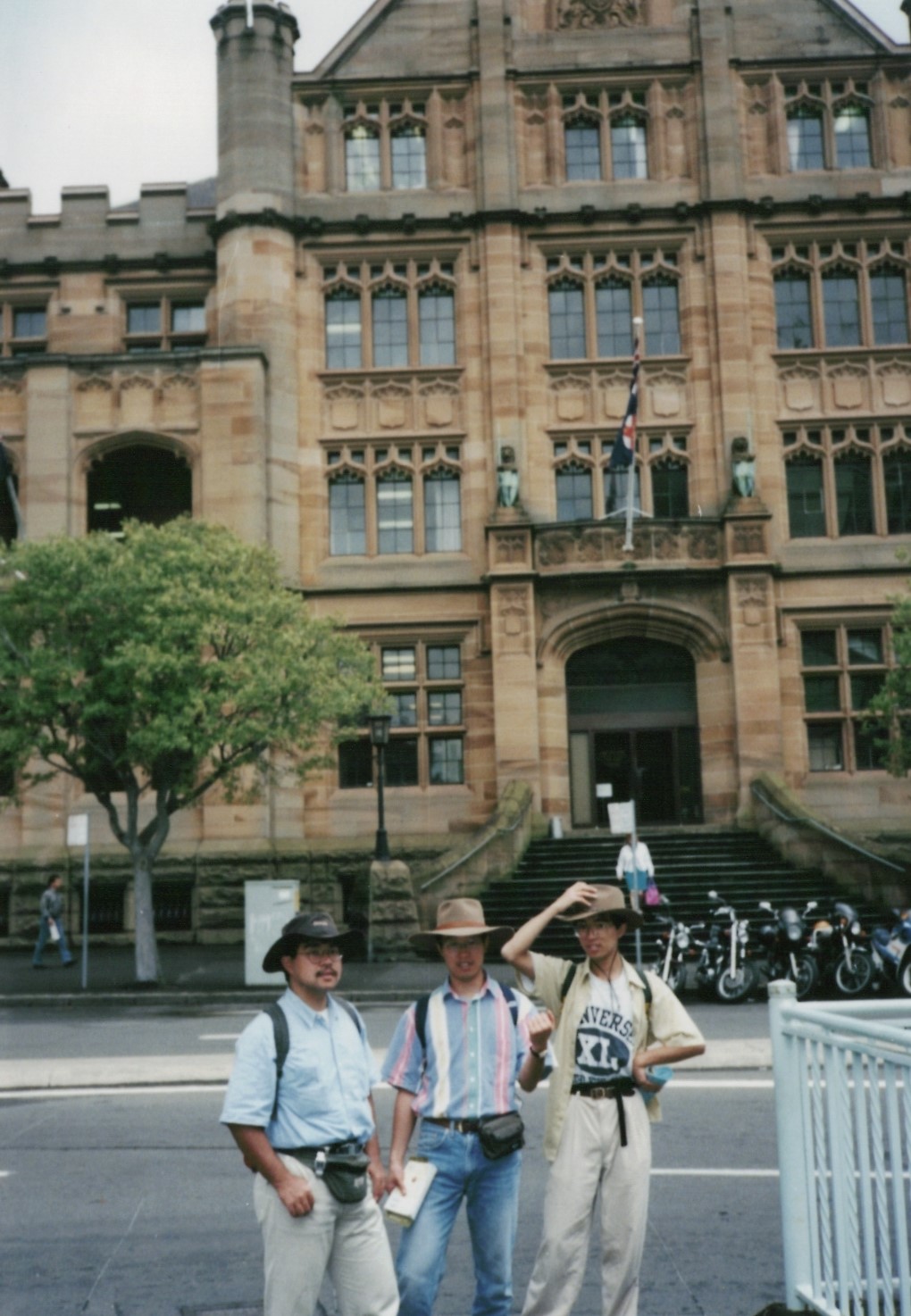 シドニータワーをバックに記念撮影。信号のところに、西村、野々垣、隠田がいます。わかるかな?
