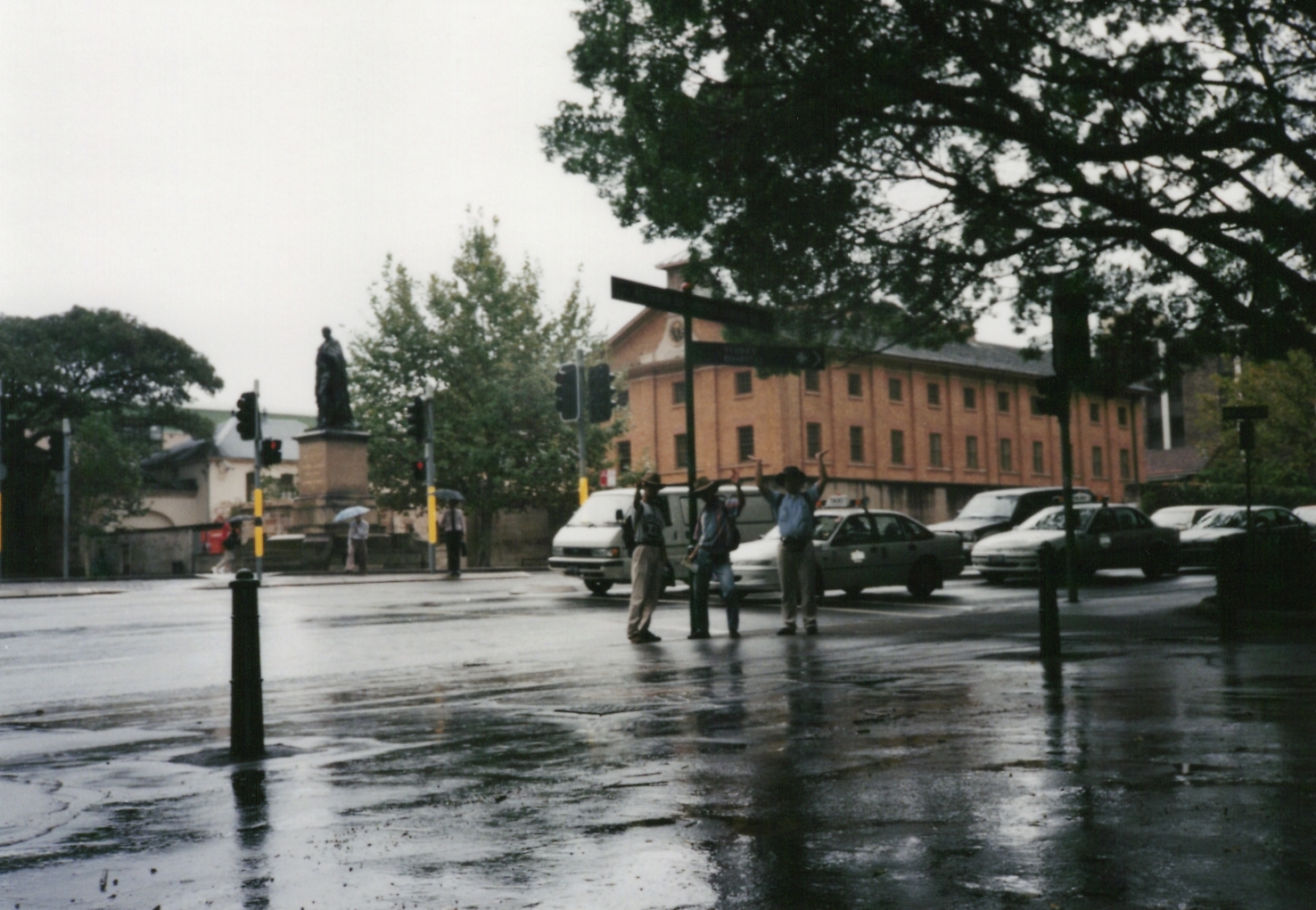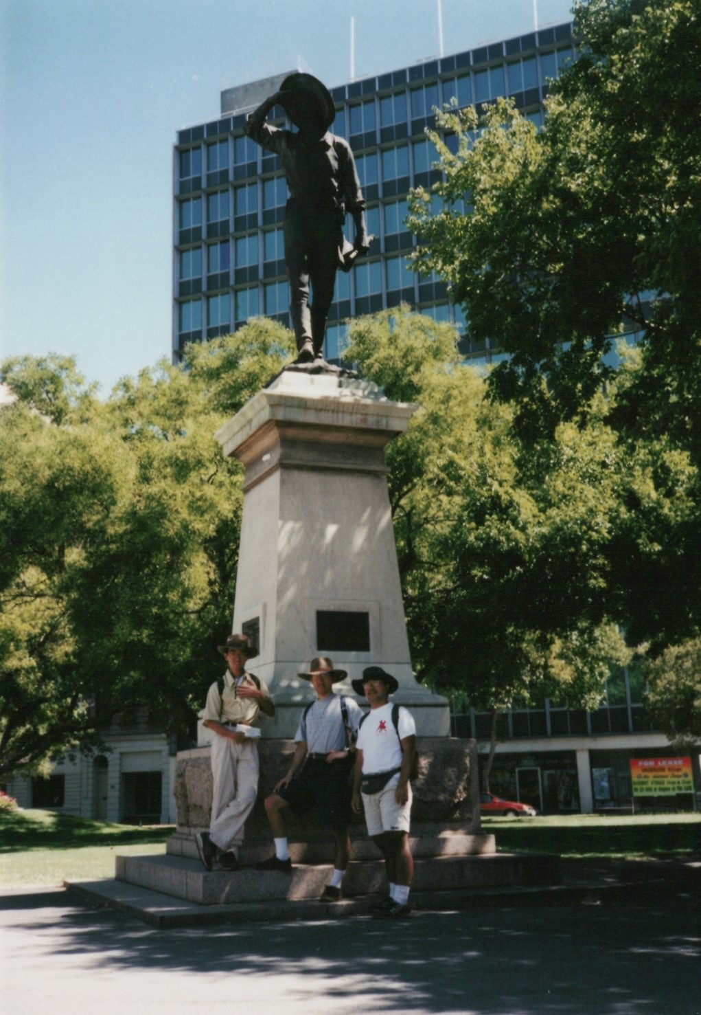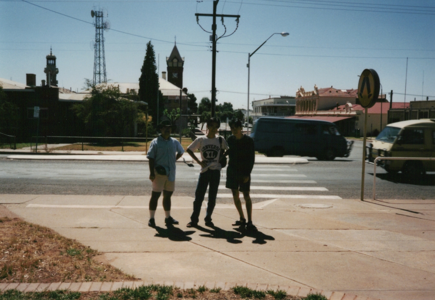 シドニータワーをバックに記念撮影。信号のところに、西村、野々垣、隠田がいます。わかるかな?