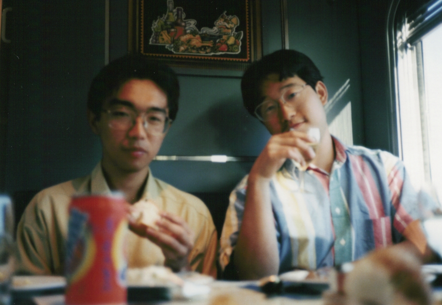 インディアン・パシフィック号の車内風景。食堂車です。野々垣、ワイングラスを片手にニヒルな表情。