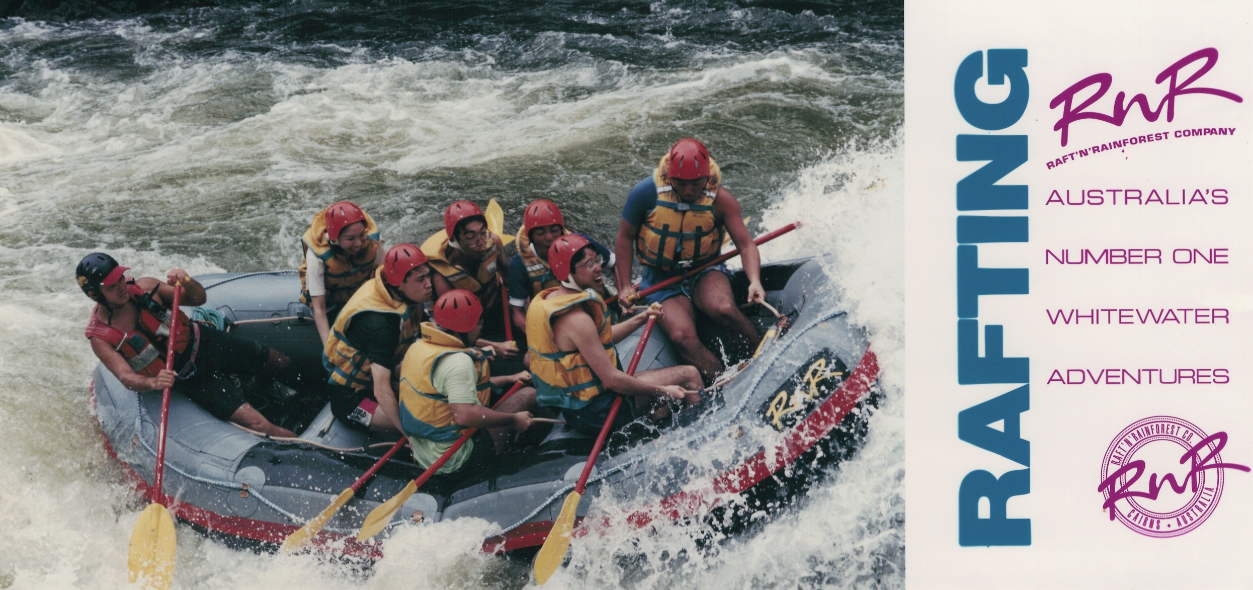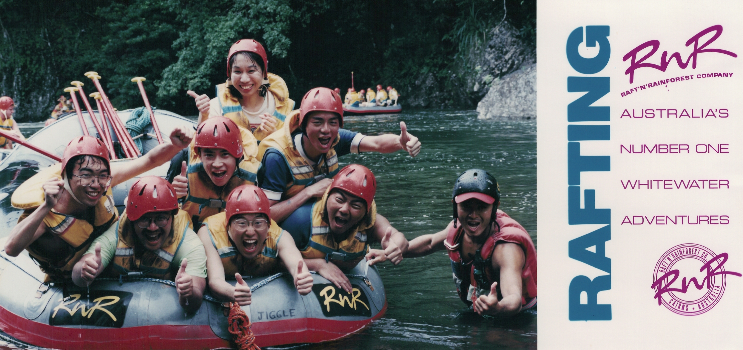 隠田・西村のお揃いのTシャツは、ケアンズのタリー川ラフティングのツアー会社(RnR)から購入したものです。胸に「RnR」のロゴが表示されています。