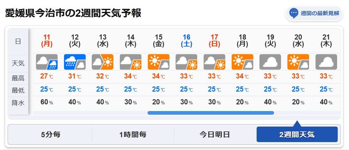 昨夜19時のウェザーニュースによると、12日の今治は小雨が降った後曇りになるとのこと。